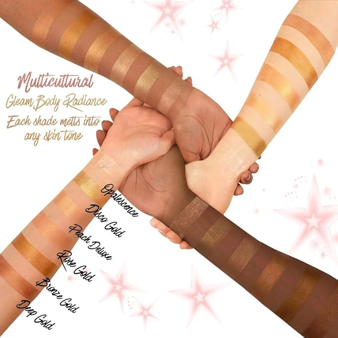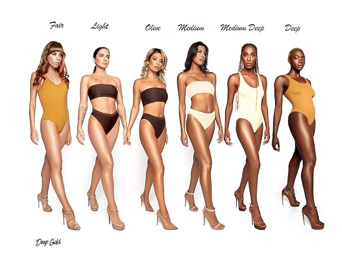 - Deep Gold: Deep Gold is a rich golden chocolate shade with red undertones that evokes a rich tropical glow. The perfect shade to perfect & even medium to dark skin tones, or for fair to medium skin tones use to achieve a dark rich tan from head to toe. Use as a primer for face, mix with foundation or all over body for perfected glowing skin. Gleam’s lightweight moisturizing makeup will help diminish minor imperfections while hydrating skin and improving skin appearance.
