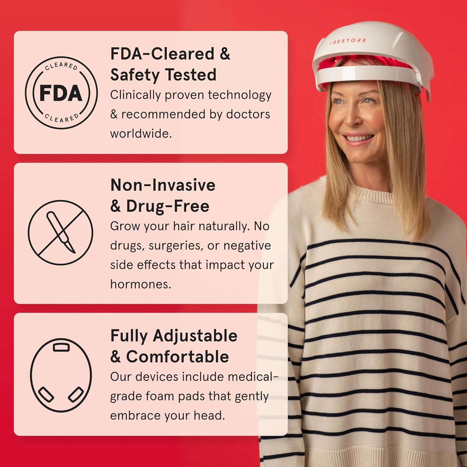 - iRestore Laser Hair Growth System is an FDA-cleared hair loss treatment and laser hair growth device for treating alopecia, receding hairline, balding and thinning hair to stimulate hair growth for women and men.