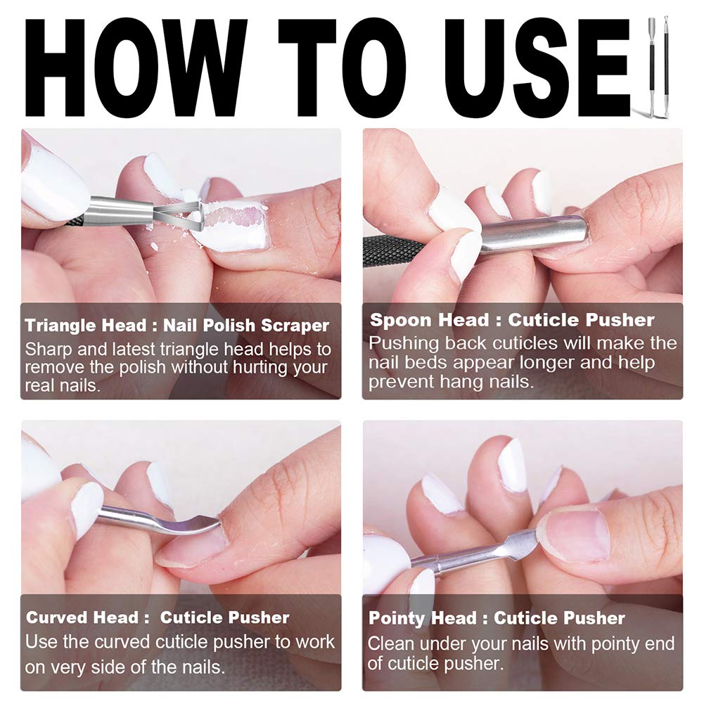- MULTIFUNCTION PACKAGE: The Cuticle Cleaning and Removal Set consists of 2 pieces of Nail Art Tools with 4 types of functional heads, which can be together used to push back the cuticle, scrape the softened Gel Polish and remove the residue or hangnails.