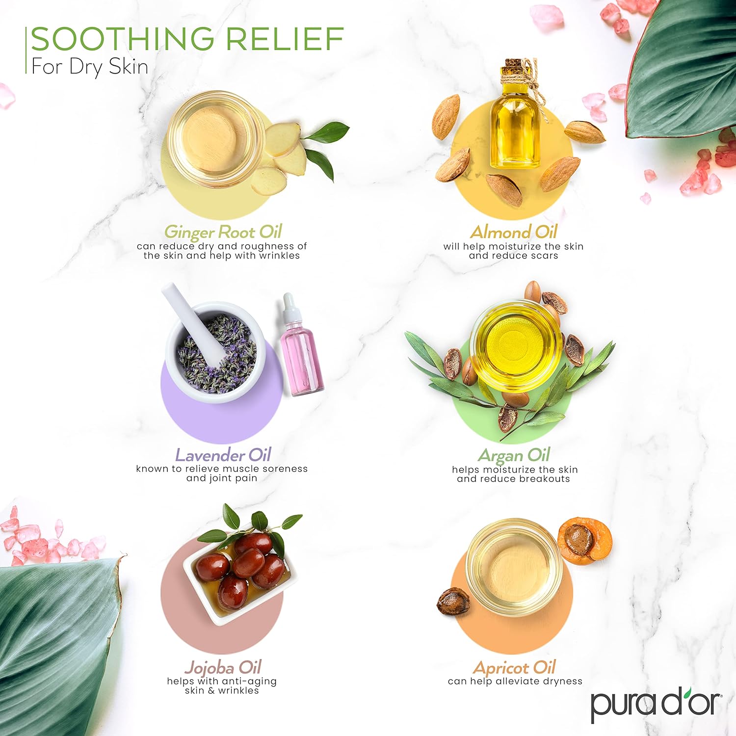 - REMARKABLY RELAXING: PURA D'OR Massage Therapy Oil contains a powerful combination of organic carrier oils that work together to help soothe and calm aches, pains, muscle tightness, and soreness in the back arms legs or shoulders for better wellness.