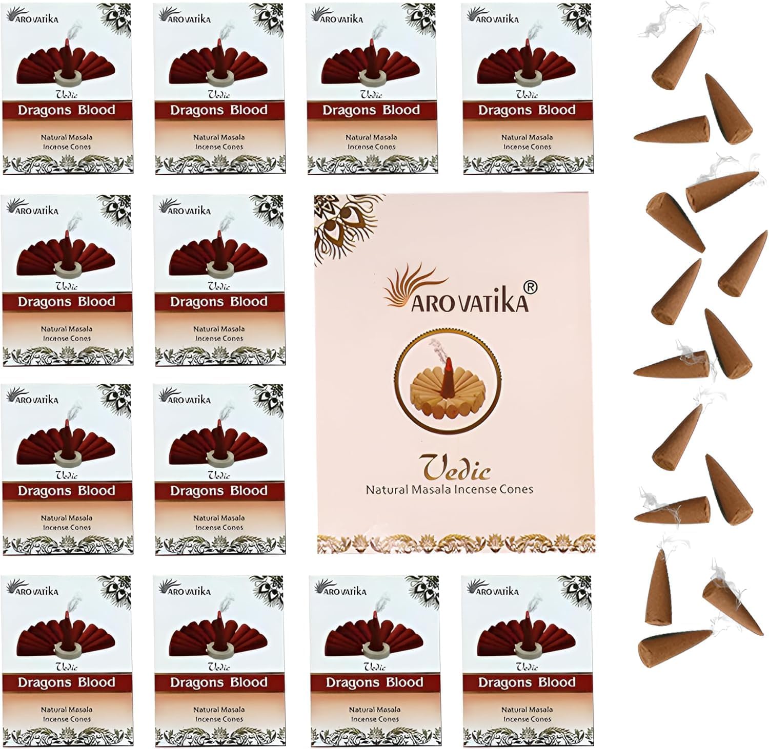 ARO VATIKA Vedic Dragons Blood Natural Masala 120 Incense Cones in Pack of 12 Boxes | Environment-Friendly Dhoop | Best for Prayer, Reiki, Meditation & Relaxation | Burn Time- 25 mins