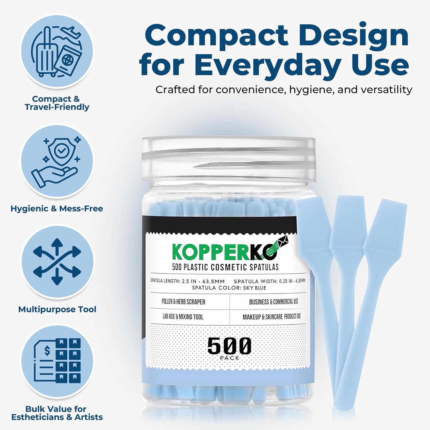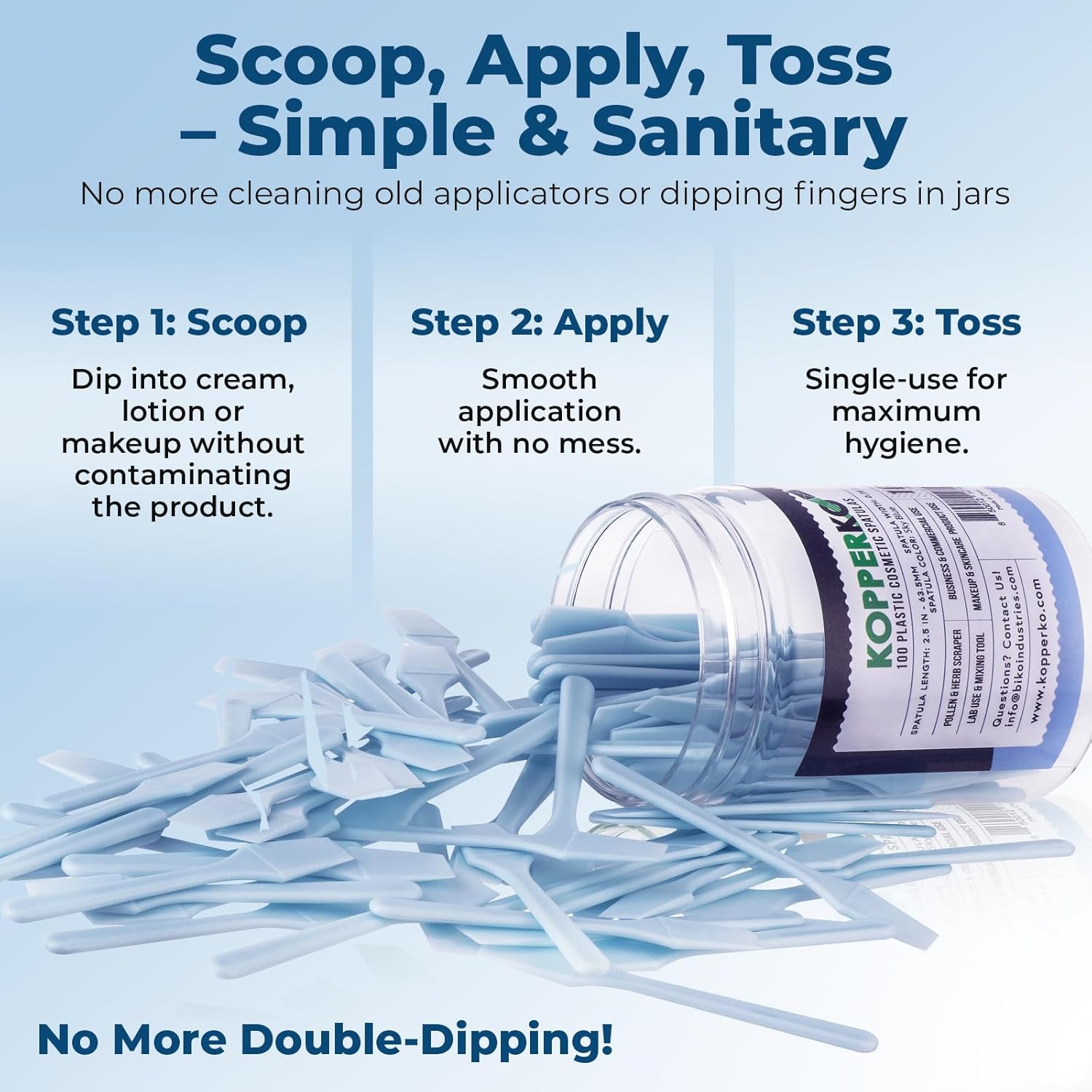 - Clean Out Your Containers: Maximize product use with our 500 pack of 0.25"x2.5" disposable makeup sample spatulas. Easily extract creams, lotions, or makeup from containers, even in tight spaces, without getting product under your nails