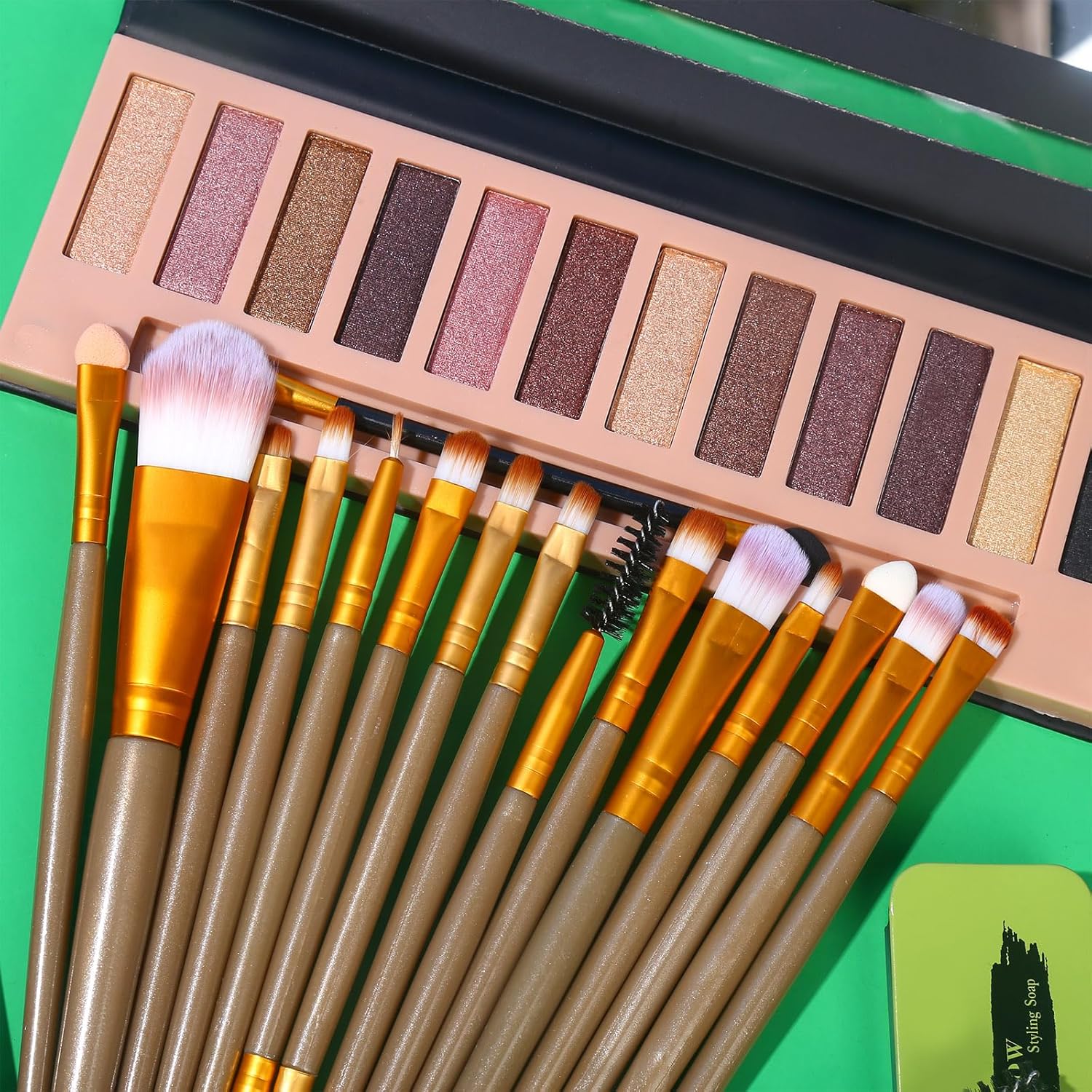- [All in One] Makeup gift set features 12 colors shimmer eyeshadow pallet, black waterproof eyeliner pencil and mascara. Plus 3pcs matte liquid lipstick and 12 pcs makeup brushes set. Styling brow soap kit and makeup sponge. And there is cute quicksand shimmering makeup bag equipped with all these things you need for daytime or nighttime dazzle.
