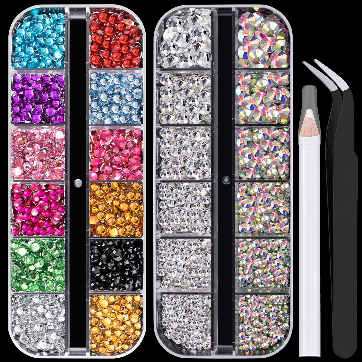 - 💎WHAT YOU WILL RECEIVE -- 1 Box of 12 Colors And 4 Sizes Flatback Colorful Nail Art Crystal Rhinestones; 1 Box of 6 Sizes Flatback Round AB&Clear Gem Stones; 1 Pc of Picker Pencil; And 1 Pc of Tweezer. This Set Is Good for Both Professional Nail Tech Salons and Starters For Nail Art Or Decorations.