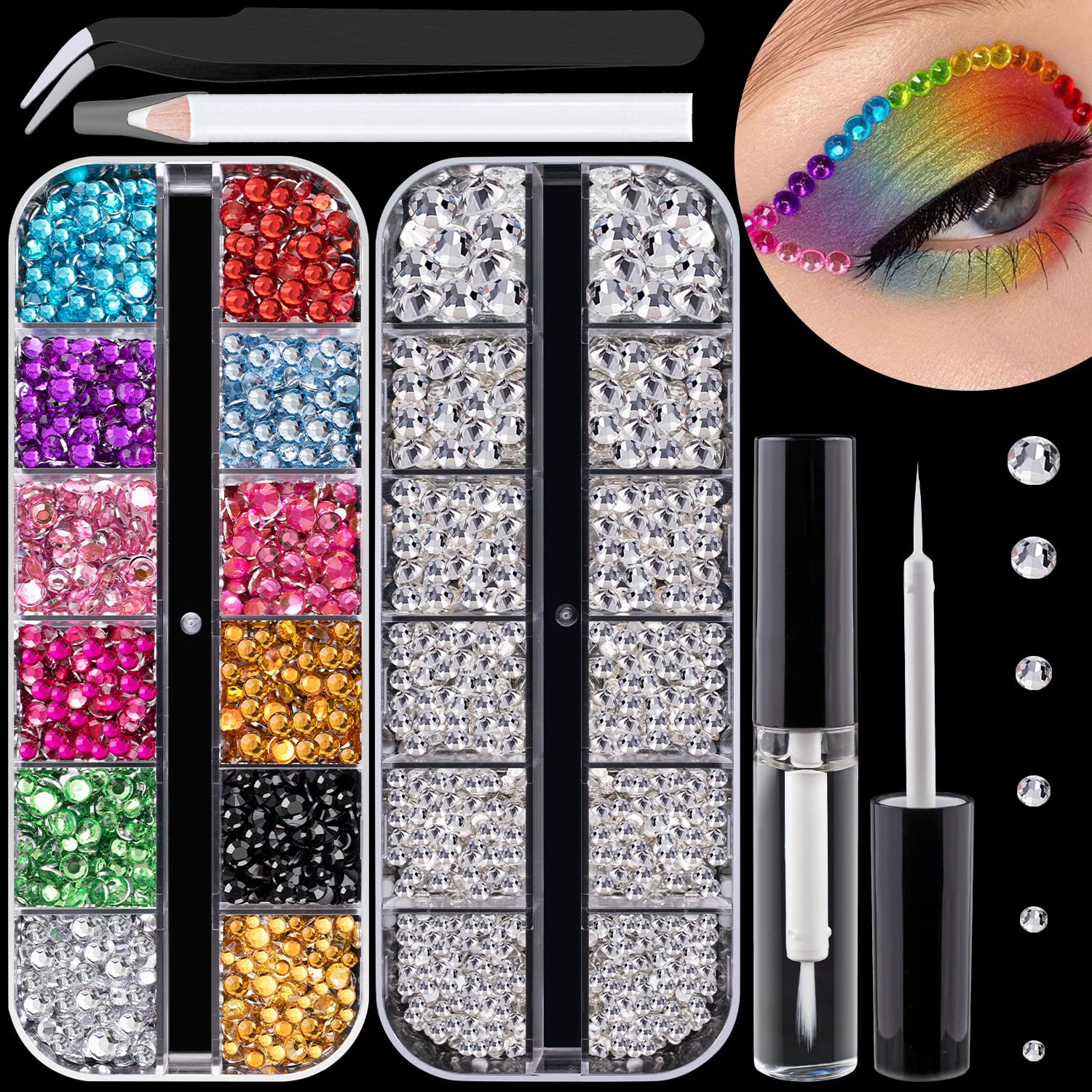 Flat Back Rhinestone Kits Colorful Rhinestones+Transparent White Gems With Quick Dry Makeup Glue+Picker Pencil+Tweezer For Nail Art And Face Make-up