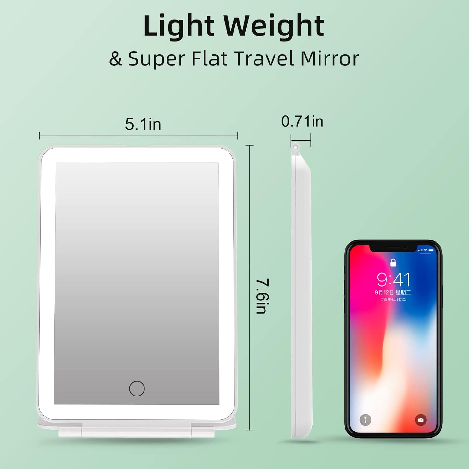 - TRAVEL LIGHTED MIRROR:This foldable rechargeable mirror with lights is 5*7.5 inch,334g,just a ultra-thin Ipad Mini Size.The slim, lightweight and compact design makes the Eclipse your new travel buddy
