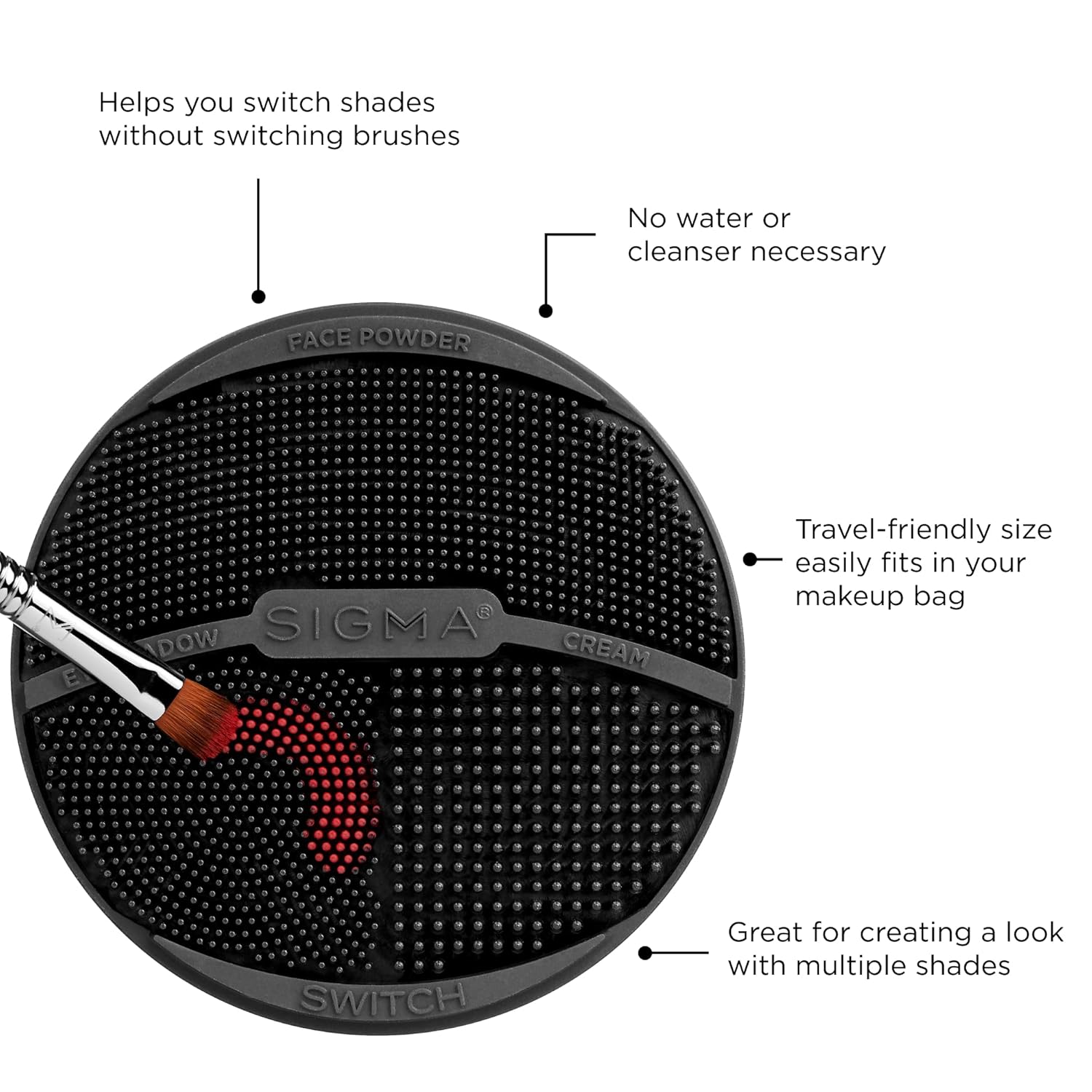 - BRUSH CLEANER TOOL FOR SHADE SWITCHING: Presenting the Sigma Switch: A seamless solution for switching between shades without compromising color integrity. With this many textured make up tool, you can effortlessly remove pigment on your best makeup brushes and seamlessly transition to a new shade mid-application!