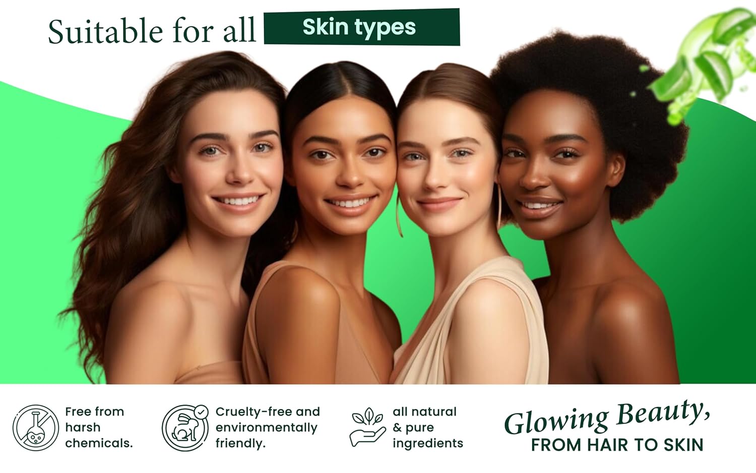 - Our pure Aloe Vera spray is perfect for all skin types as it is free from harsh chemicals like, colors, preservatives, and sulfates that can cause irritation and damage to your skin. It is also cruelty-free and environmentally friendly, making it the perfect choice for those who care about the planet and its inhabitants.