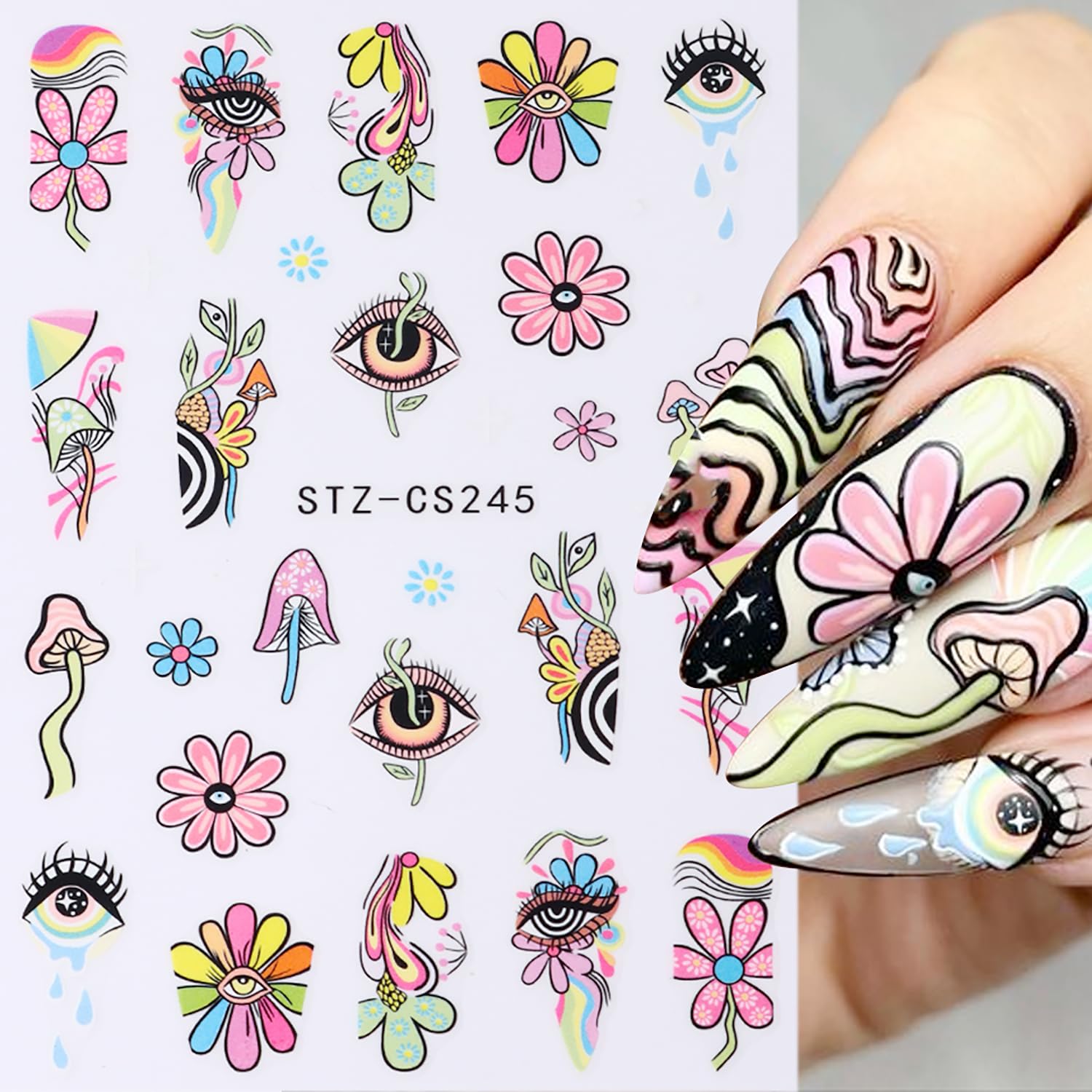 8 Sheets Nail Art Stickers Graffiti Flower Evil Eye 3D Self-Adhesive Nail Decals Rainbow Mushroom Star Moon Designs Nail Decorations Summer Nail Stickers Colorful Nail Supplies for Women DIY Manicure