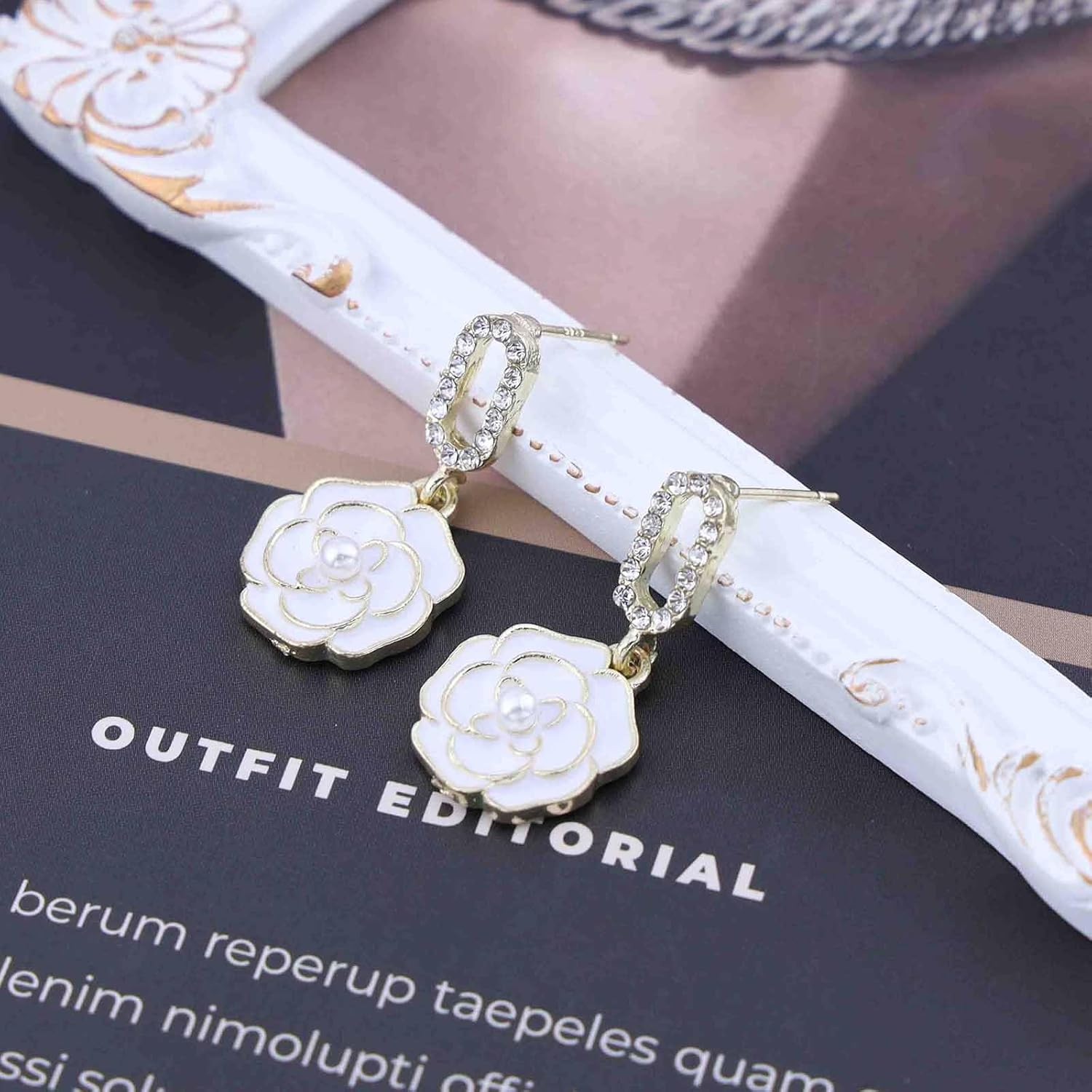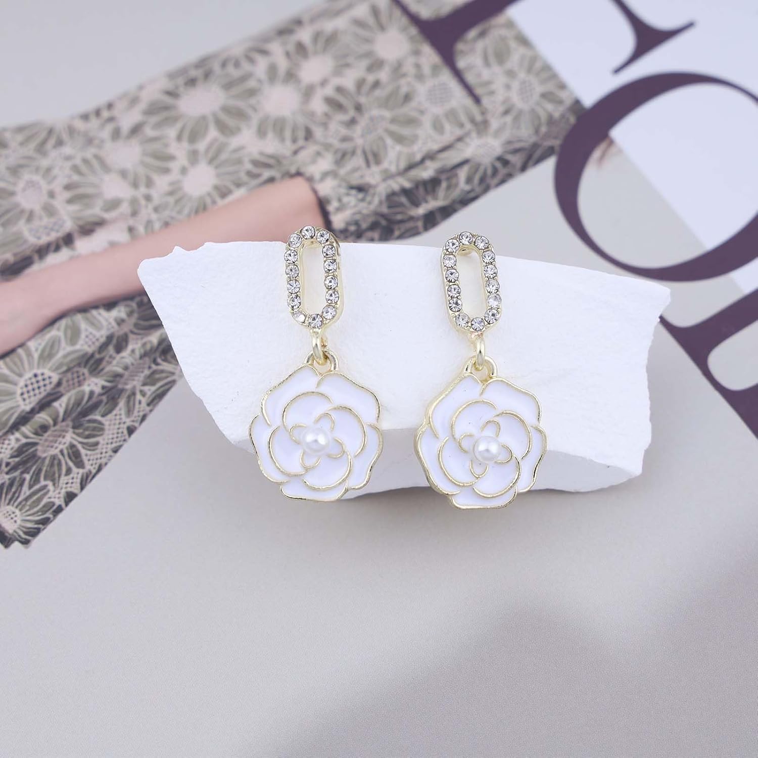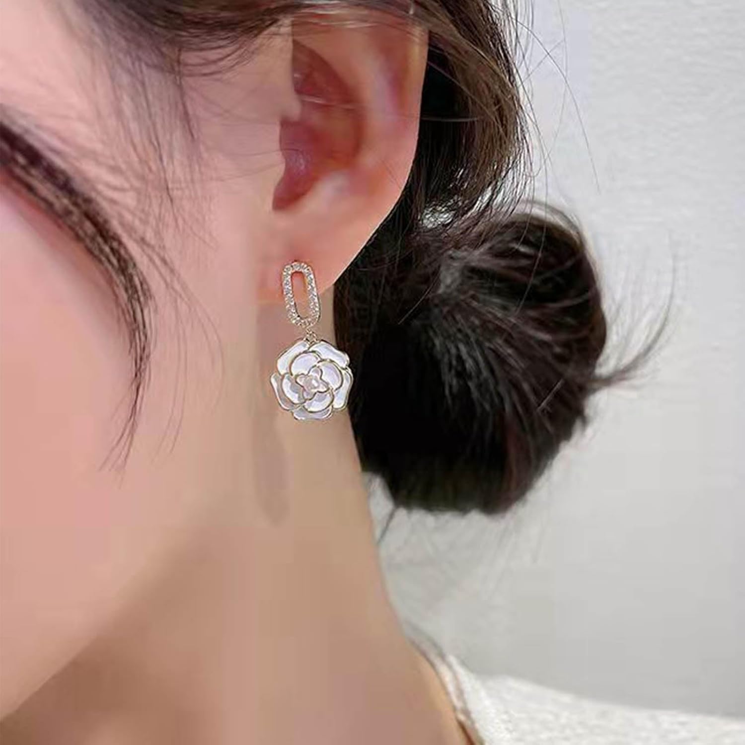 - White camellia flower earrings.Item Details:Handmade Item.Size:As Shown.Color:White.Materials:Quality Alloy/Crystal.Location:Ear.Style:Boho/Vintage.