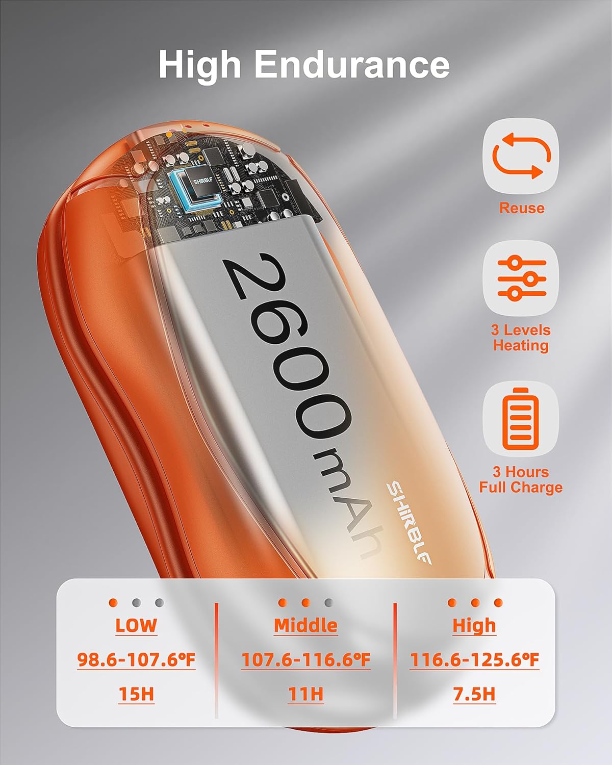 - 【Rechargeable & Three Levels of Temperature】Electric hand warmers, 5200mah rechargable hand warms with up to 12 hours battery life, USB hand warmer. With 3-speed indicator light, you can adjust three different temperatures, the use of time is 7-9.5-12 hours. Choose the right temperature for a comfortable using experience.