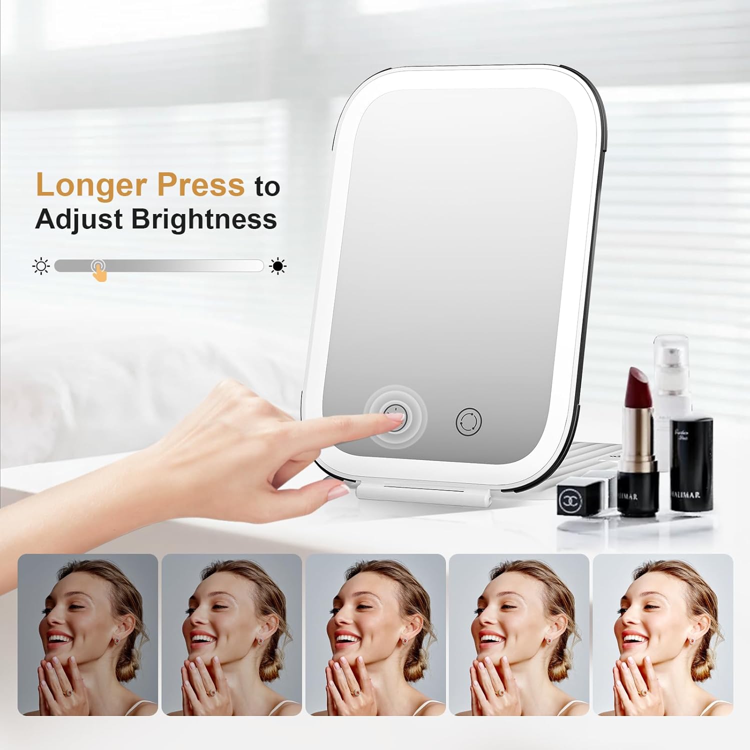 - 3 Color Lighting and Dimmable Touch Screen:This lighted travel makeup mirror with 80 LEDs, offers white lights, warm lights and cool lights. Easily Short Press for color temp between a warm glow to white glow.Longer Press the high-sensitivity touch button can brighten or darken the mirror between 100%, 50% and 10% brightness,just use it at your ease