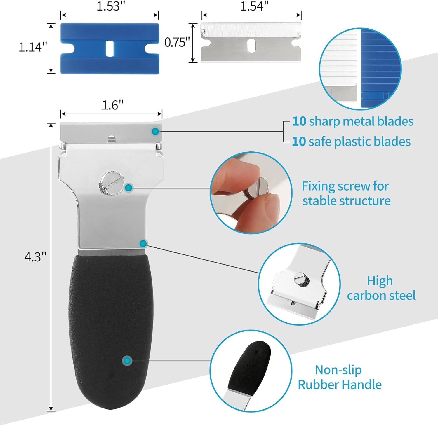 - COMPREHENSIVE KIT: The 2 pack scrapers come with extra 10 metal blades and 10 plastic blade. With a total of 20 blades at your disposal, you're equipped to effortlessly tackle a range of cleaning challenges while ensuring an enough supply of replacements.