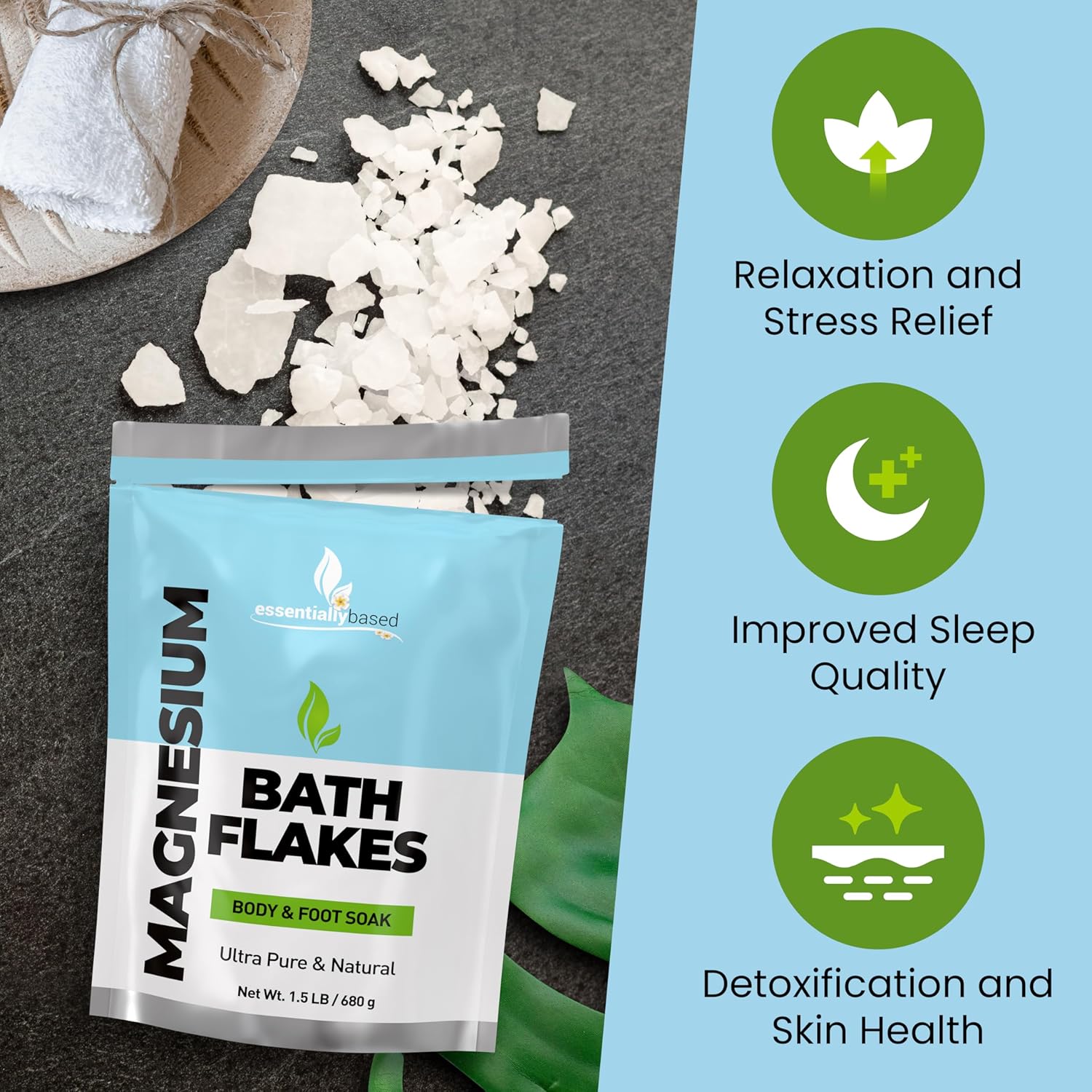 - Our pure magnesium flakes for bath promote relaxation and relieve muscle tension with our high-quality magnesium soak. These magnesium bath flakes have the potential to revolutionize your bathing experience.