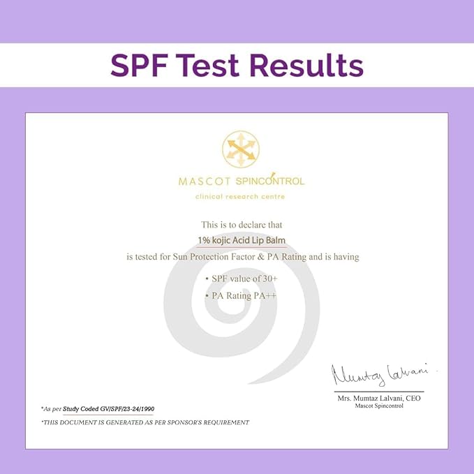 • Product Benefits : 1% Kojic Acid Lip Balm With Alpha Arbutin & Hyaluronic Acid, SPF 30 PA++ for Dark & Pigmented Lips - 4g 1% Kojic Acid Lip Balm With Alpha Arbutin & Hyaluronic Acid, SPF 30 PA++ for Dark & Pigmented Lips - 4g