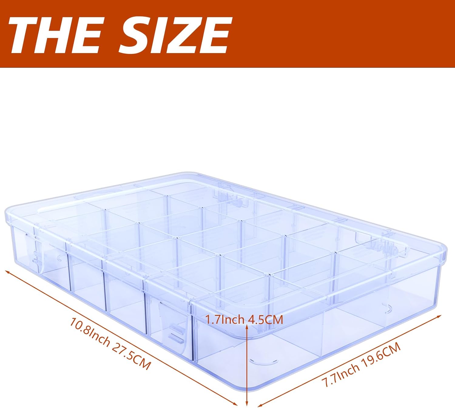 - Conveniently store your belongings with our Adjustable Clear Organizer Box/ Plastic Component Case, featuring 18 compartments! Measuring 10.8L x7.7Wx1.7H, it's perfect for organizing jewelry, crafts, and more! Keep your small items organized with our 18-grid clear plastic storage box. It's simple and practical, making it a must-have for any home or office.