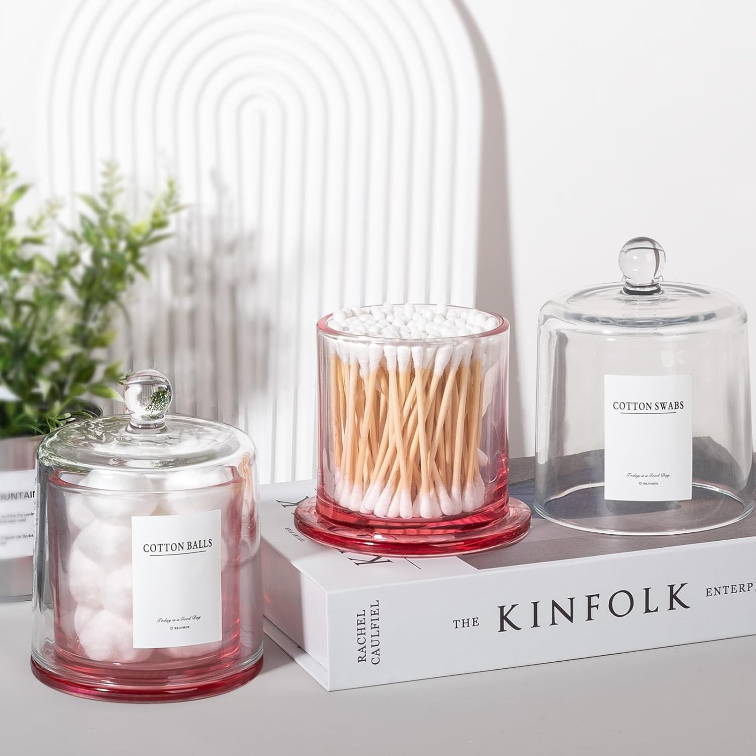 rejomiik 2 Pack Qtip Holder Thick Glass Apothecary Jars with Lid for Bathroom Accessories Vanity Organizers and Makeup Storage for Cotton Ball, Swabs, Makeup Sponges, Candy, Jewelry, Pink