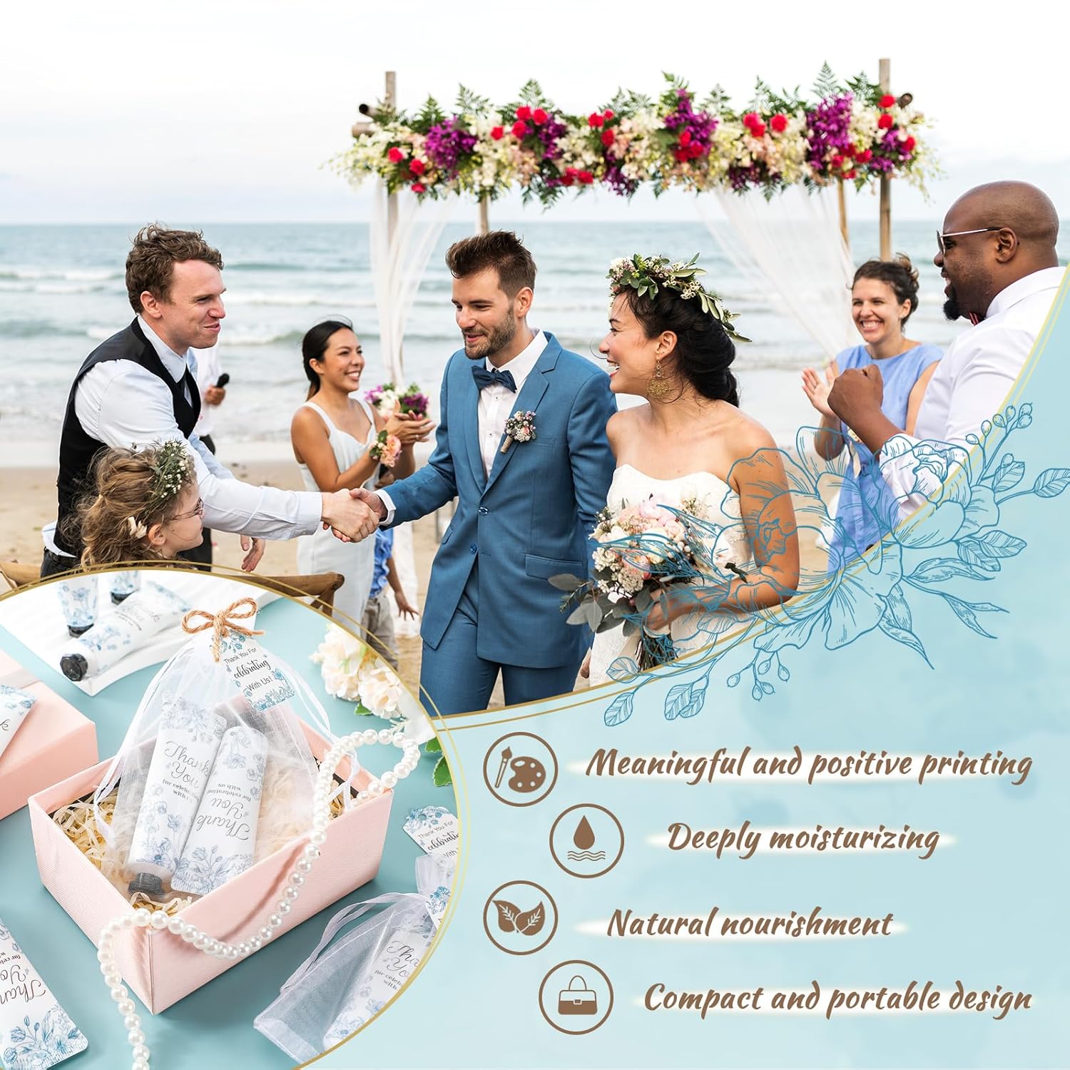 - Elegant Design: each hand cream has a blue flower pattern design and a "thank you" copy, creating a pleasant feeling and enhancing the atmosphere of the party; This charming and lovely gift adds a touch of elegance and unexpected joy to most weddings and engagement parties; This is an ideal souvenir for weddings and baby shower parties