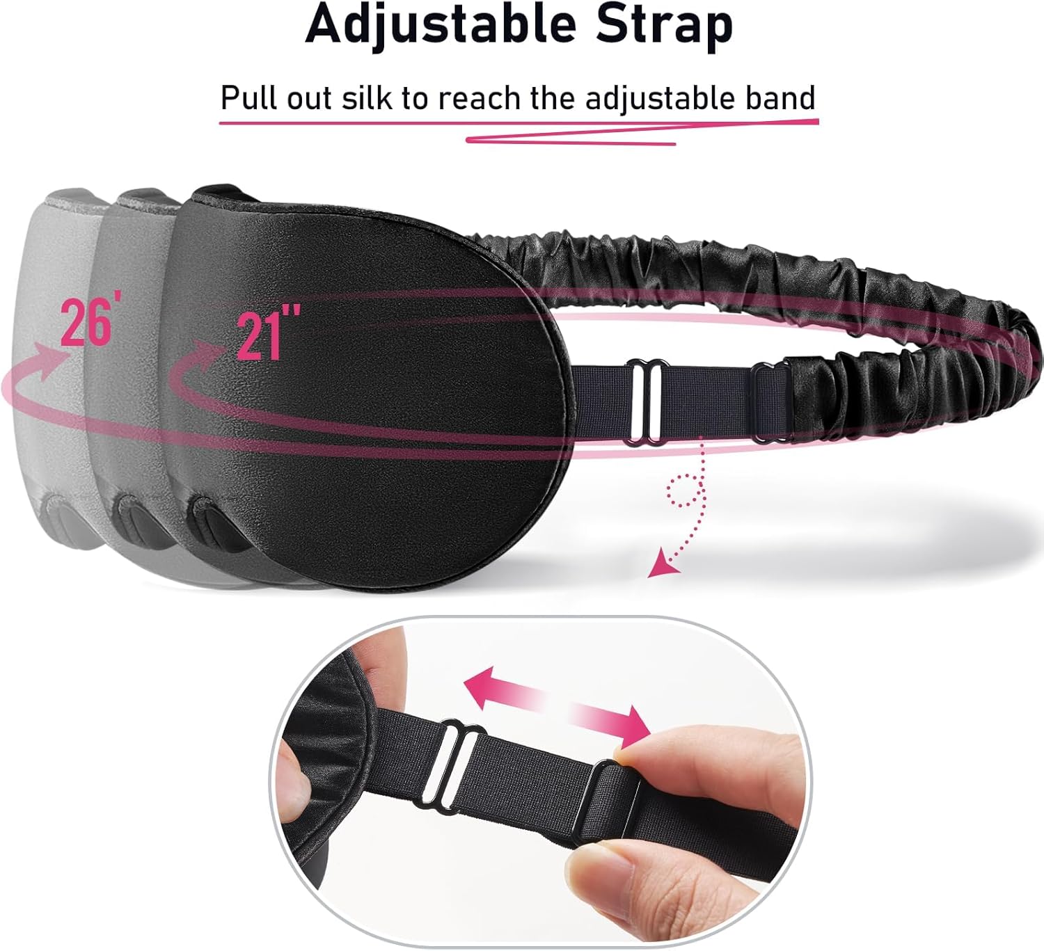 - Adjustable Strap: Our elastic buckle strap covered with 100% Mulberry silk on both sides, making it so comfy on your head, and doesn't tangle/stick your hair unlike other masks can be easily adjusted from 21 inches to 26 inches to fit all different head sizes—men, women, and kids