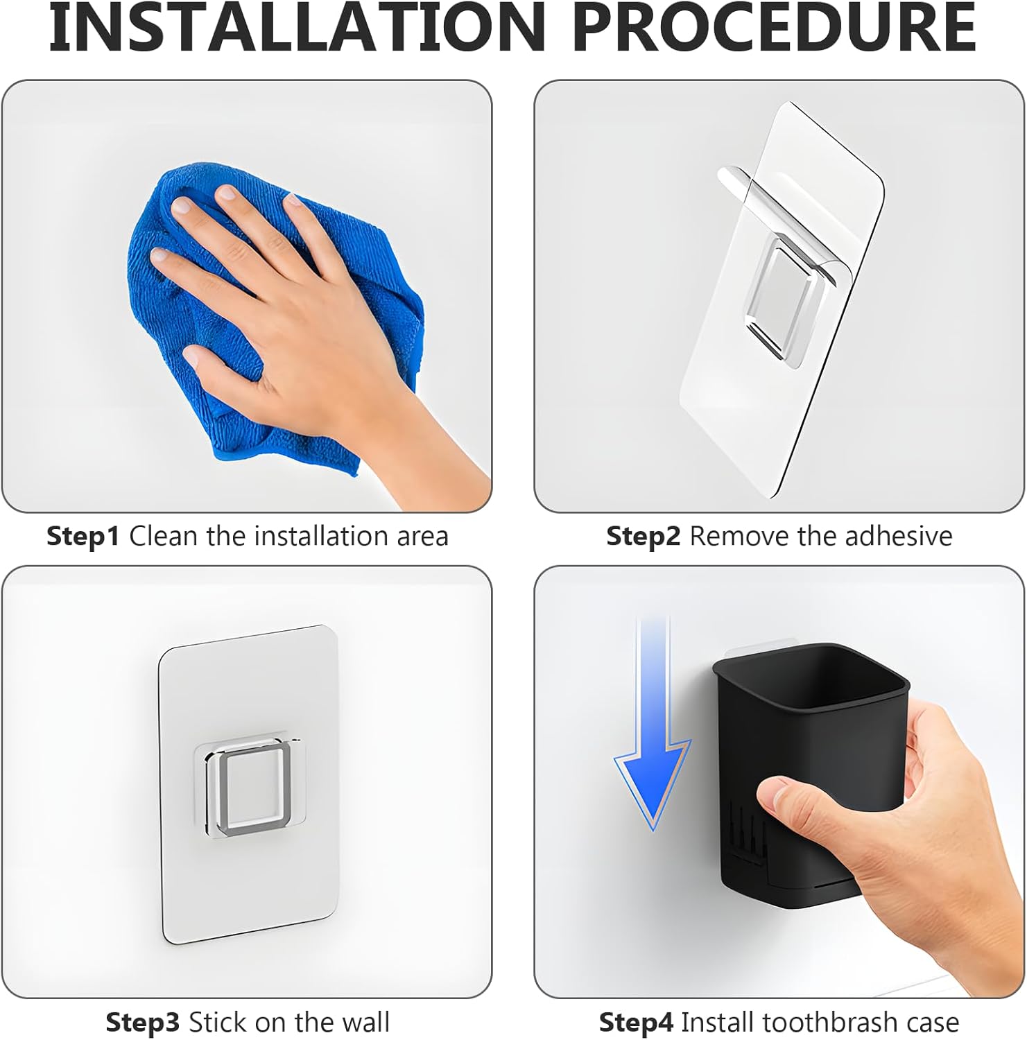 - 【Easy to Install】--No drills or holes are needed. Transparent adhesive leaves no damage to wall, please clean up the back side and the surface of the wall before use, tear off the protective film of the bracket and stick it directly on a smooth surface, If you want to use it in another location, you can tear it off and reuse it. The toothbrush holder wall mounted can be removed at any time for cleaning and hanging again.