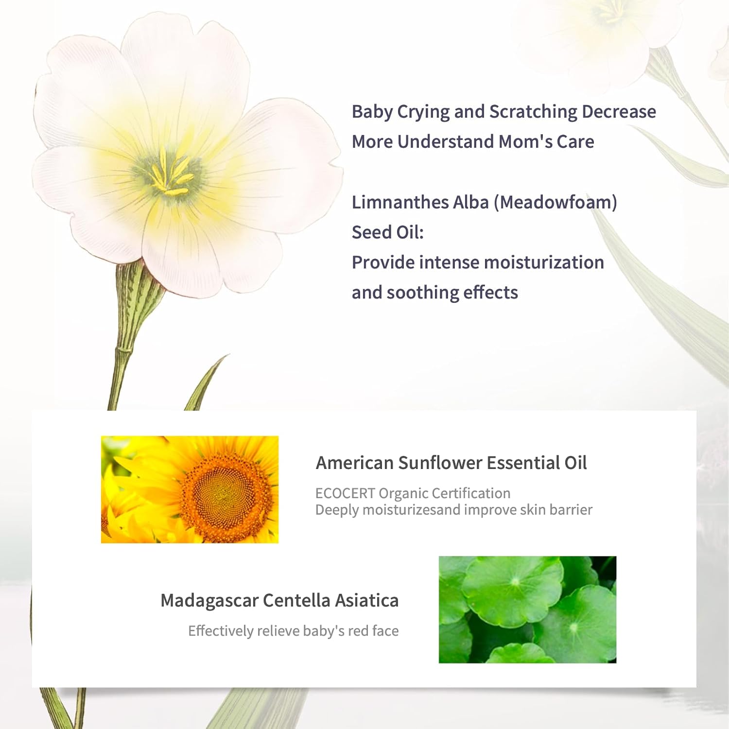 - Key Ingredients: Limnanthes Alba (Meadowfoam) Seed Oil:Rich in antioxidants and long-chain fatty acids, it provides intense moisturization and soothing effects. Organic Sunflower Seed Oil: Maintains the integrity of the skin’s stratum corneum, preventing irritation and protecting the skin barrier. Centella Asiatica Extract: Accelerates skin repair in damaged areas, soothes sensitive skin, and reduces redness.