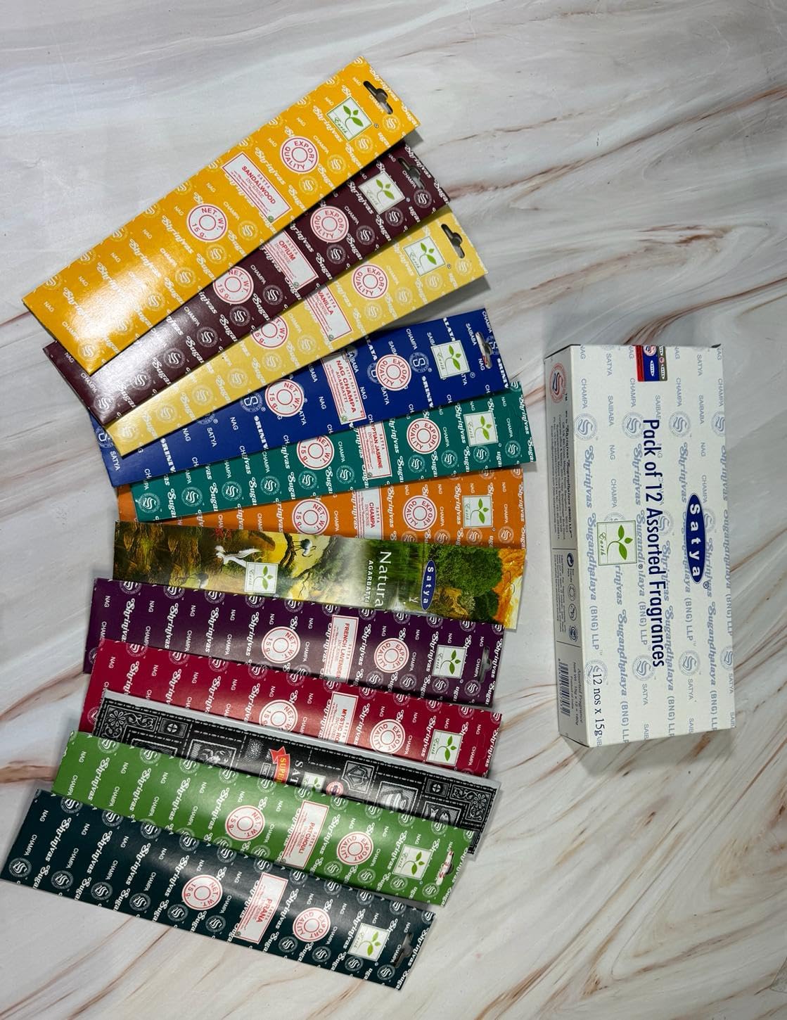 Satya Incense 15g Set of 12 Nag Champa, Super Hit, Sacred Sandalwood, Pure Patchouli, Mystic Rose, Vanilla, Prana, Natural, French Lavender, Opium, Egyptian Jasmine, Champa, VarietyPack01