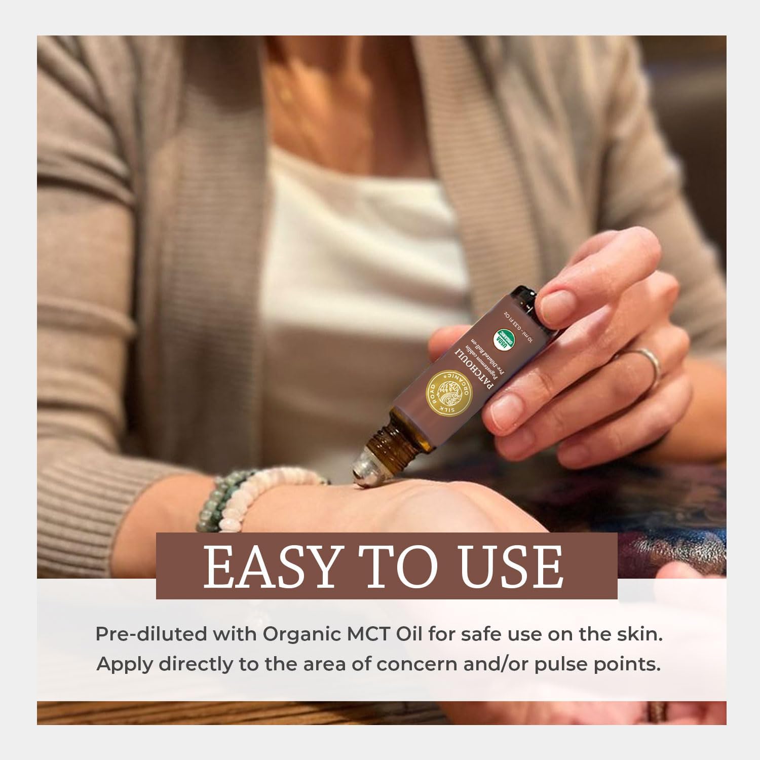 - USDA CERTIFIED ORGANIC essential oil roll-on. Our Patchouli oil has a spiced, earthy and woody scent. Its calming properties center your mind & soothe your soul, evoking sensations of positivity, and pure bliss.
