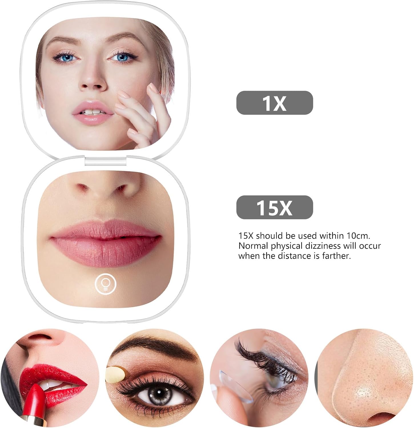 Compact Mirror with Light,15X Magnifying Travel Mirror for Purse, Dual LED Pocket Mirror with 3 Color Modes, Auto Shut-Off, Portable Makeup Mirror, Essential Mini Travel Magnifying Mirror