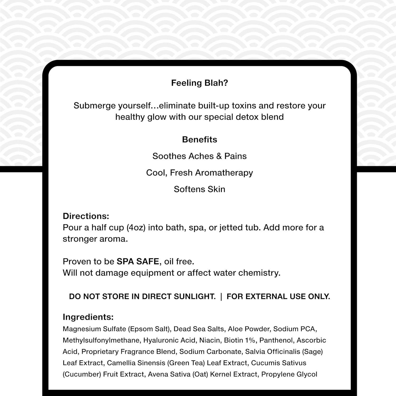 - CLEAN, FRESH SOAK FOR YOUR SPA RITUALS: This mineral-forward blend is designed to help reset your senses with a crisp aromatic profile and a skin-soft finish—crafted specifically for hot tubs and Jacuzzis using premium aromatherapy bath salts.
