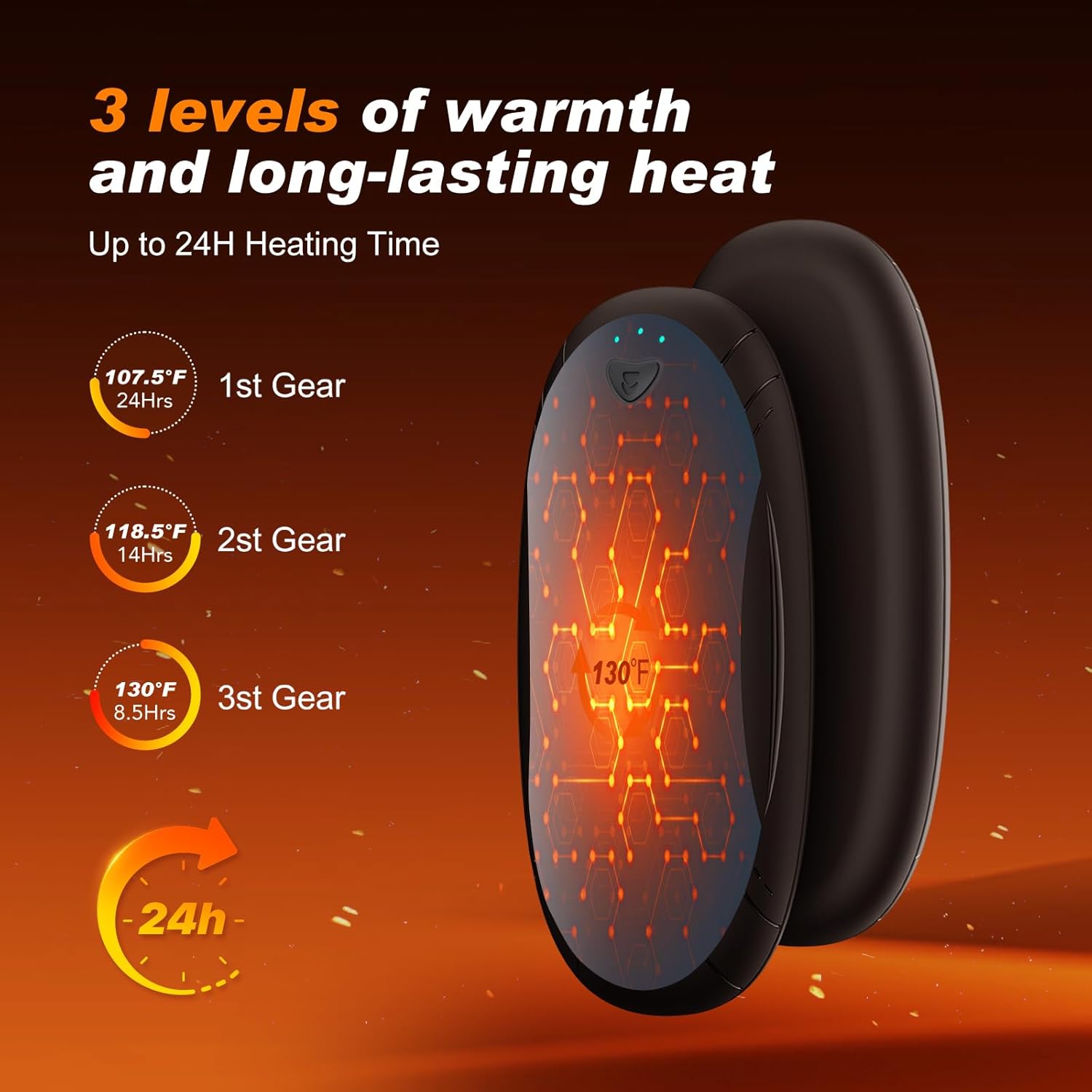 - 【AI Temperature Sensor Chip】 - It has an integrated intelligent AI temperature control chip that can provide precise 3-level heat regulation, feedback, and monitoring. By continuously analyzing and detecting the temperature between the hand warmer and your hands, it ensures precise heat control for optimal comfort and safe heating, with a maximum temperature of 131℉.