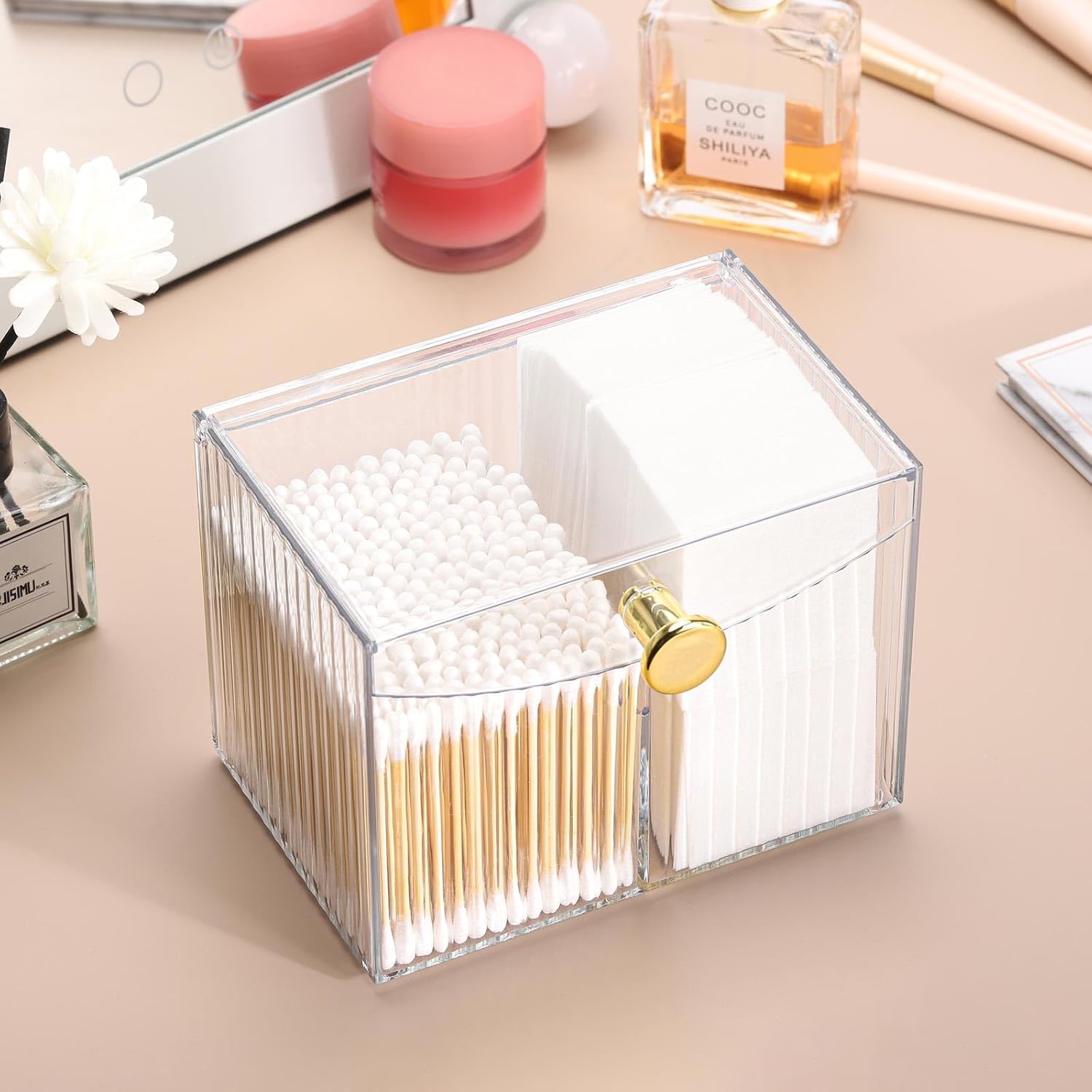 - 【Storage Items】 The container can store many small items, such as cotton swabs/balls, lipstick, nail remover cotton, makeup brushes