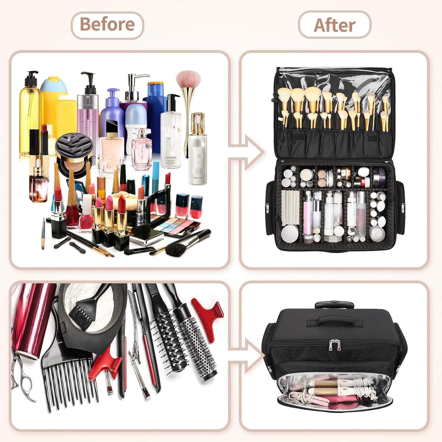 - Retractable Trolley-Structurally Rich Professional Makeup Case - Stay organized on-the-go with adjustable dividers that let you customize the interior layout to suit your needs, keep your makeup collection neat and tidy!The top cover features a separate slot for makeup brushes, with a large capacity and a transparent PVC protective cover, waterproof and stain-resistant.
