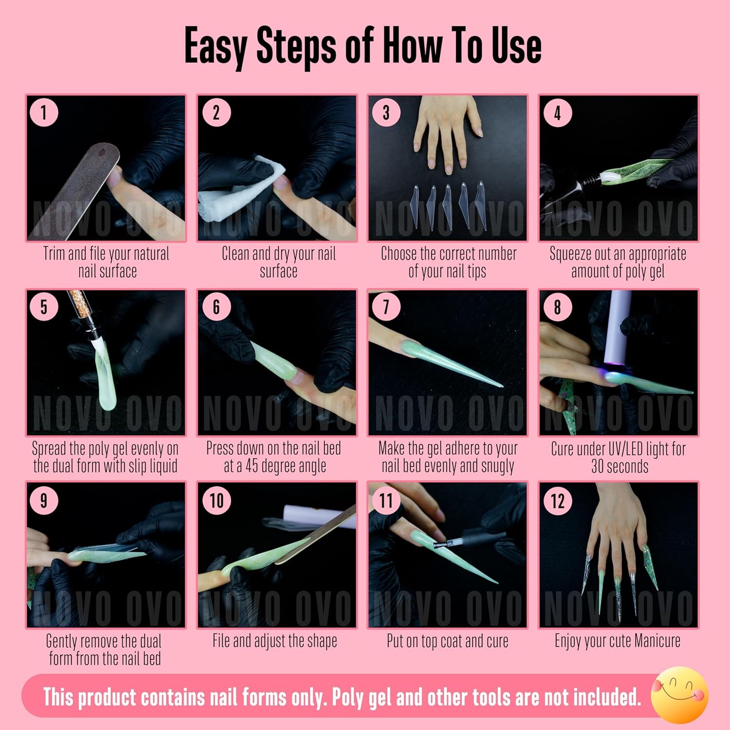 - EXPLORE OUR CREATIVE NAIL FORM UNIVERSE: In addition to these shapes, NOVO OVO offers an array of innovative dual forms, from duck nails, eagle claw nails to square, almond coffin stiletto nails, and lengths ranging from medium to Extra Long, XXL to 5XL. Choose the one that perfectly complements your style and indulge in an exquisite manicure experience with NOVO OVO.