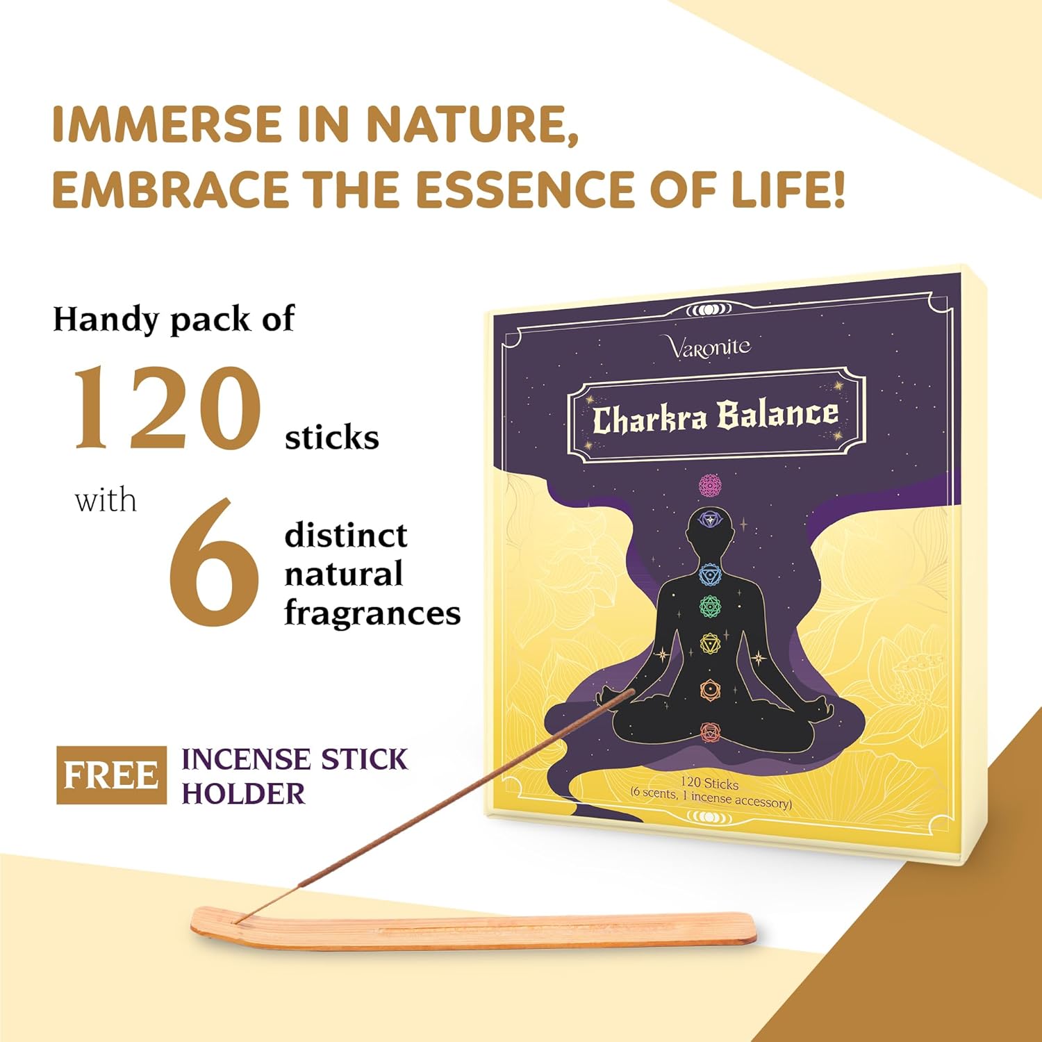 Incense Sticks - Charka Balance Incense Stick Variety Pack of 6 (120 Insence-Sticks) with Holder: Sandalwood, Bergamot, Jasmine, Lavender, Rose, Vanilla ā 7 Chakras Inscents-Stick