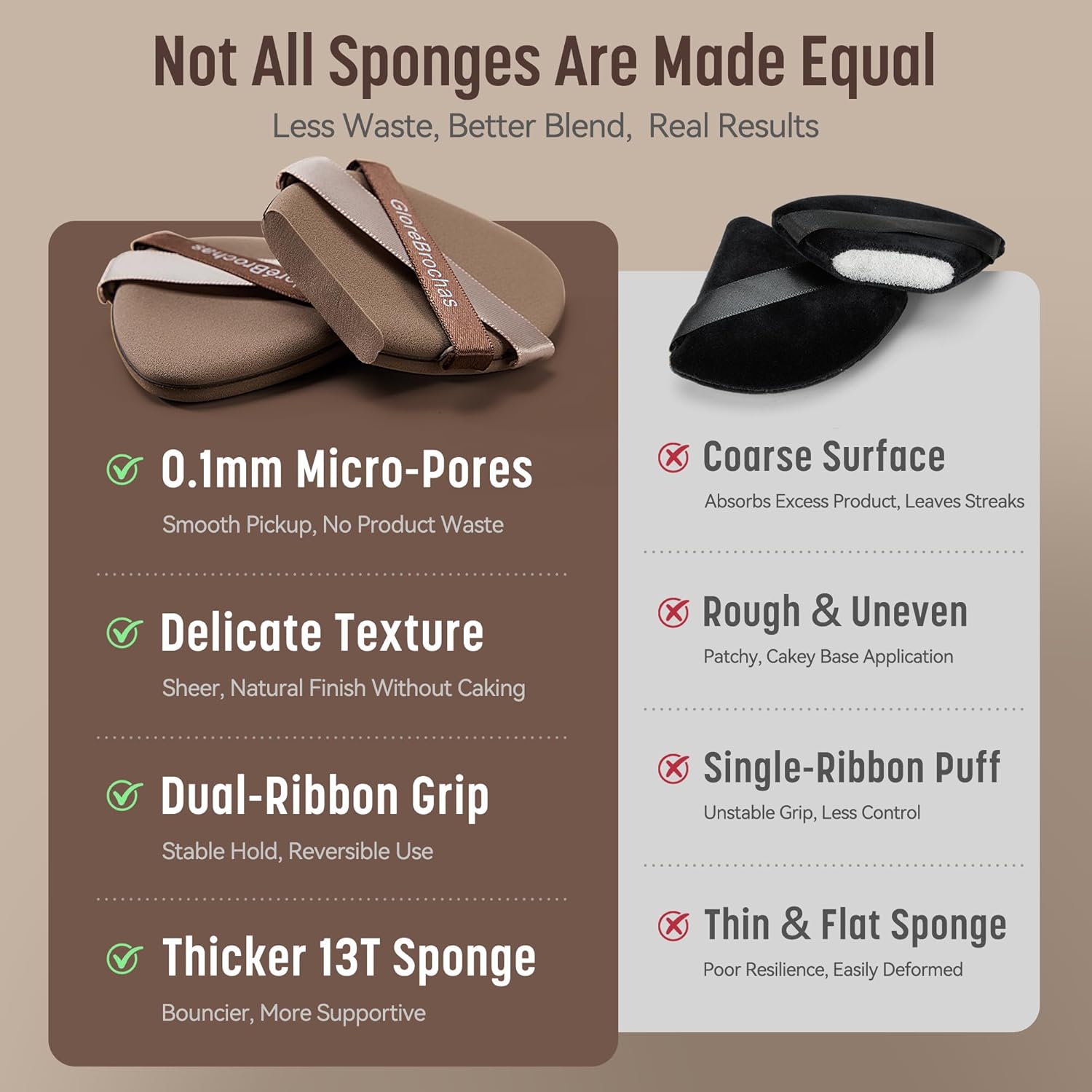 - 【Dual Ribbon Grip – Secure, Controlled, On-the-Go Ready】Unlike flimsy single straps, our dual-ribbon makeup puff offers a stable, ergonomic grip for all hand sizes—dry or damp. It gives you full control whether you're rushing to work or blending on the go.