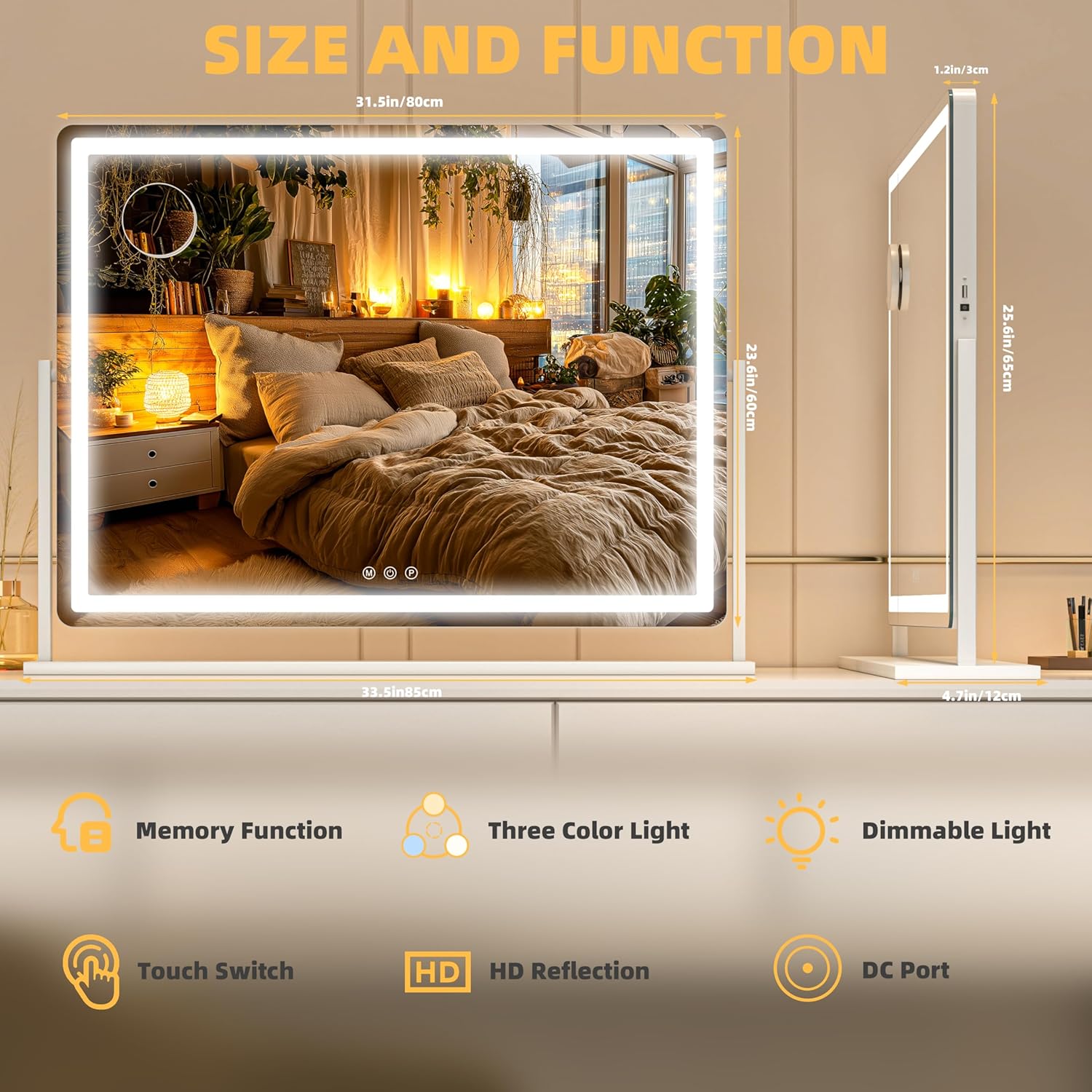 - 【Smart Touch Sensor】 Smart touch buttons for this light-up vanity mirror Simply short press power ON/OFF & change the light color, and Long press to adjust the brightness. We keep all the Functions the one touch, it can serve you great.