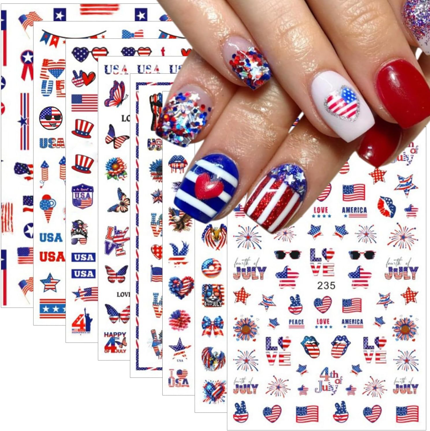 - Independence Day Nails Sticker Kit: You will get 8 sheets 3d patriotic nail art stickers decals, American flag nail designs decoration, a unique art design, attractive and creative, can add a strong holiday atmosphere.Perfect for women girls, DIY holiday nail design