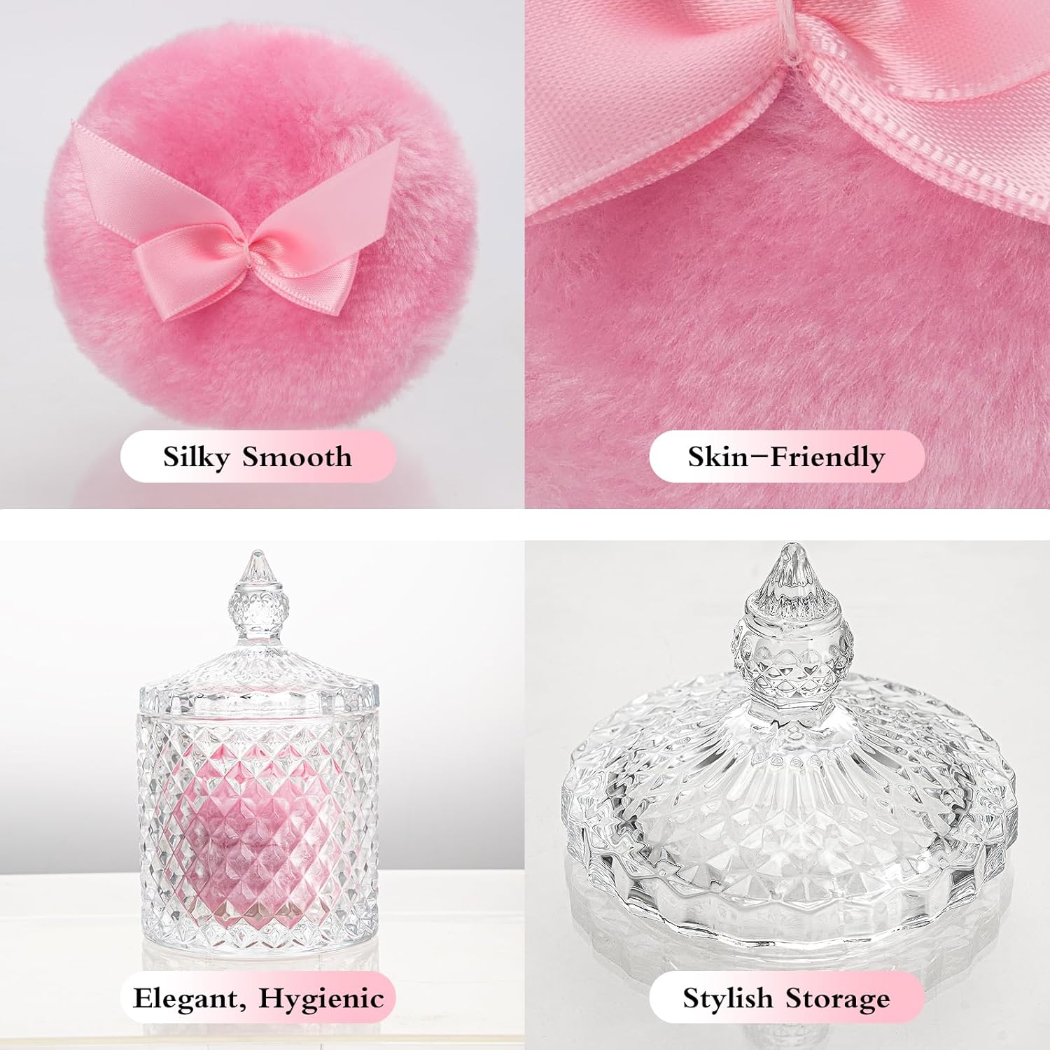 - Gorgeous Design, Premium Quality: This body powder puff and container set features 1 ultra-soft, skin-friendly powder puffs and a crystal-clear glass powder puff container. With a vintage-chic look, it adds elegance to your beauty routine. Note: Not a sealed container