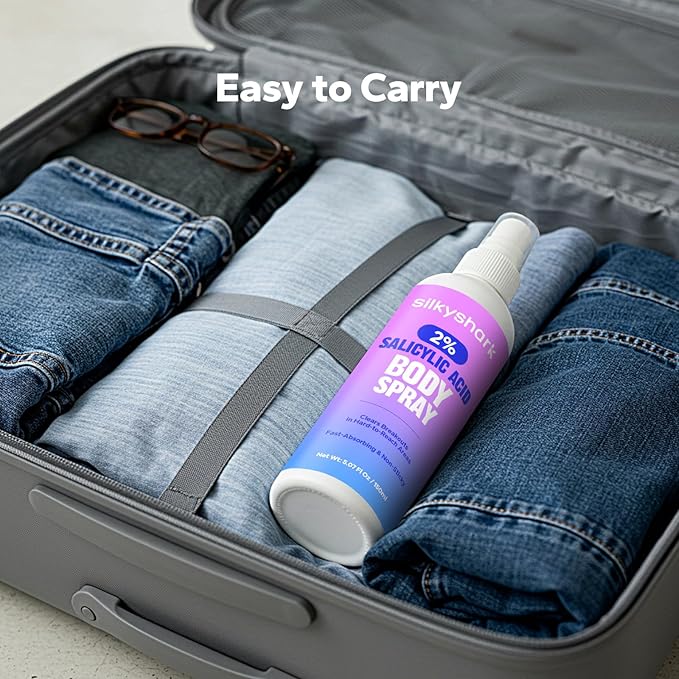- Target Stubborn Breakouts: Formulated with 2% Salicylic Acid, SilkyShark Salicylic Acid Spray helps penetrate deep into pores to exfoliate dead skin cells and reduce pore congestion—supporting the reduction of breakouts at the source. Whether you're dealing with blemishes on your chest, back, or shoulders, this lightweight formula is designed to work on problem areas without over-drying. With regular use, it supports a visibly smoother texture and a more balanced-looking complexion.