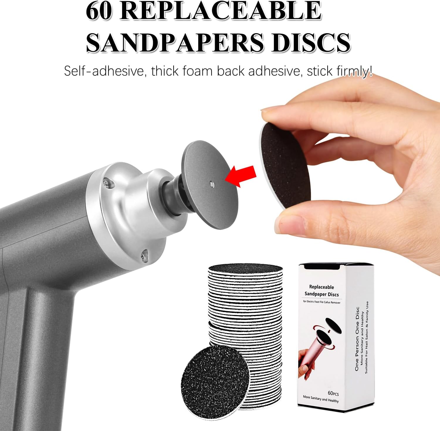 - 60PCS FOAM ADHESIVE BACKING SANDPAPER: It comes with 60 replaceable sandpapers, self-adhesive, thick foam backing, so it will stick firmly to the electric foot file and won't fall off during operation. After use, it can also be easily removed from the machine.