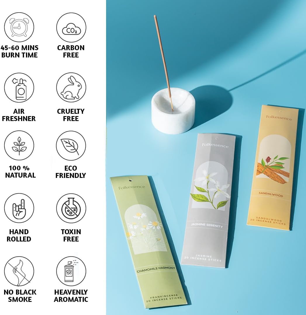 - FRAGRANCE NOTES – A refreshing blend of fragrances complemented by signature notes like Jasmine insense, Chamomile inscent, Sandalwood Incense, Rose inscents, Lavender incense. Ideal for spiritual practices, they infuse any space with an uplifting, comforting aroma.