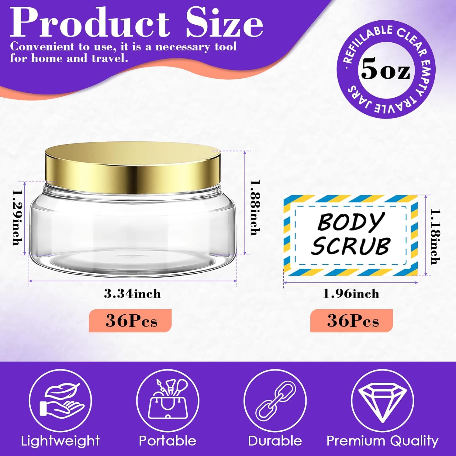 - 【PACKAGE INCLUDES】- You will get 36pcs 5oz clear plastic body butter containers with lids, which is convenience for different uses. You will also get 36pcs decorative labels for distinction and 6pcs spatulas for dispensing or mixing.
