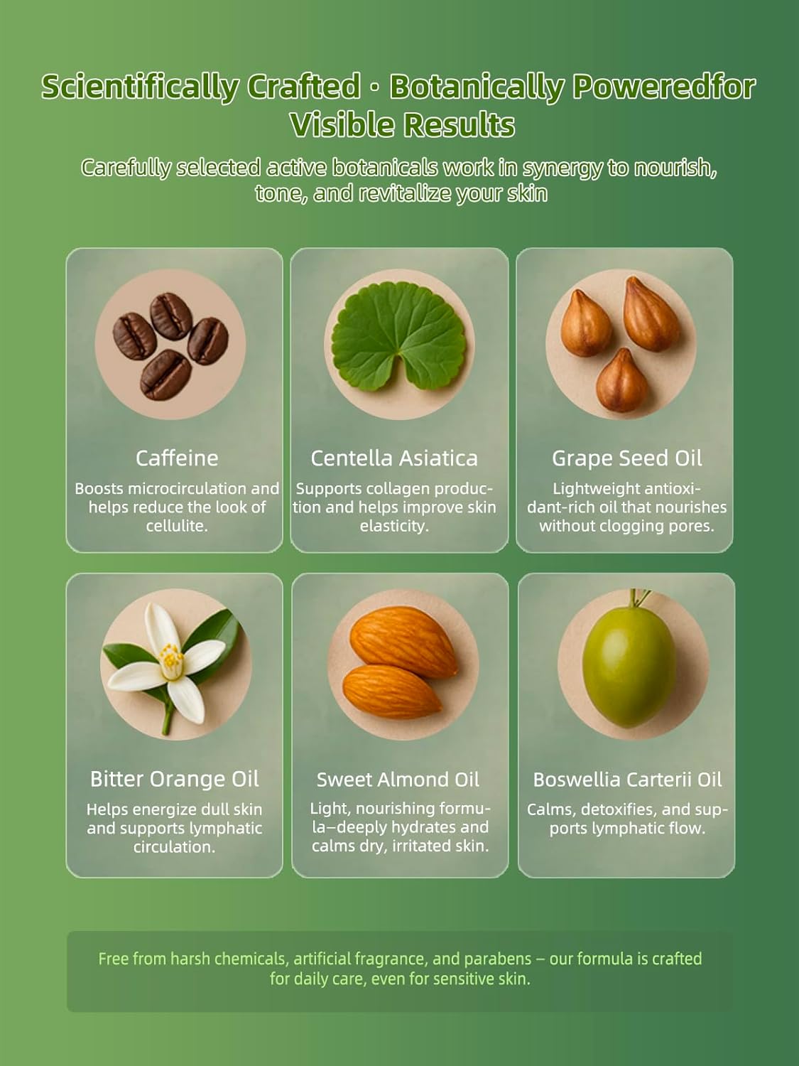 - 4-in-1 Botanical Formula – Smooth, Detox, Firm, Nourish: Powered by caffeine, centella asiatica, bitter orange oil, and a blend of nourishing carrier oils, this multi-action formula helps reduce cellulite, support lymphatic flow, tighten skin, and deeply hydrate.