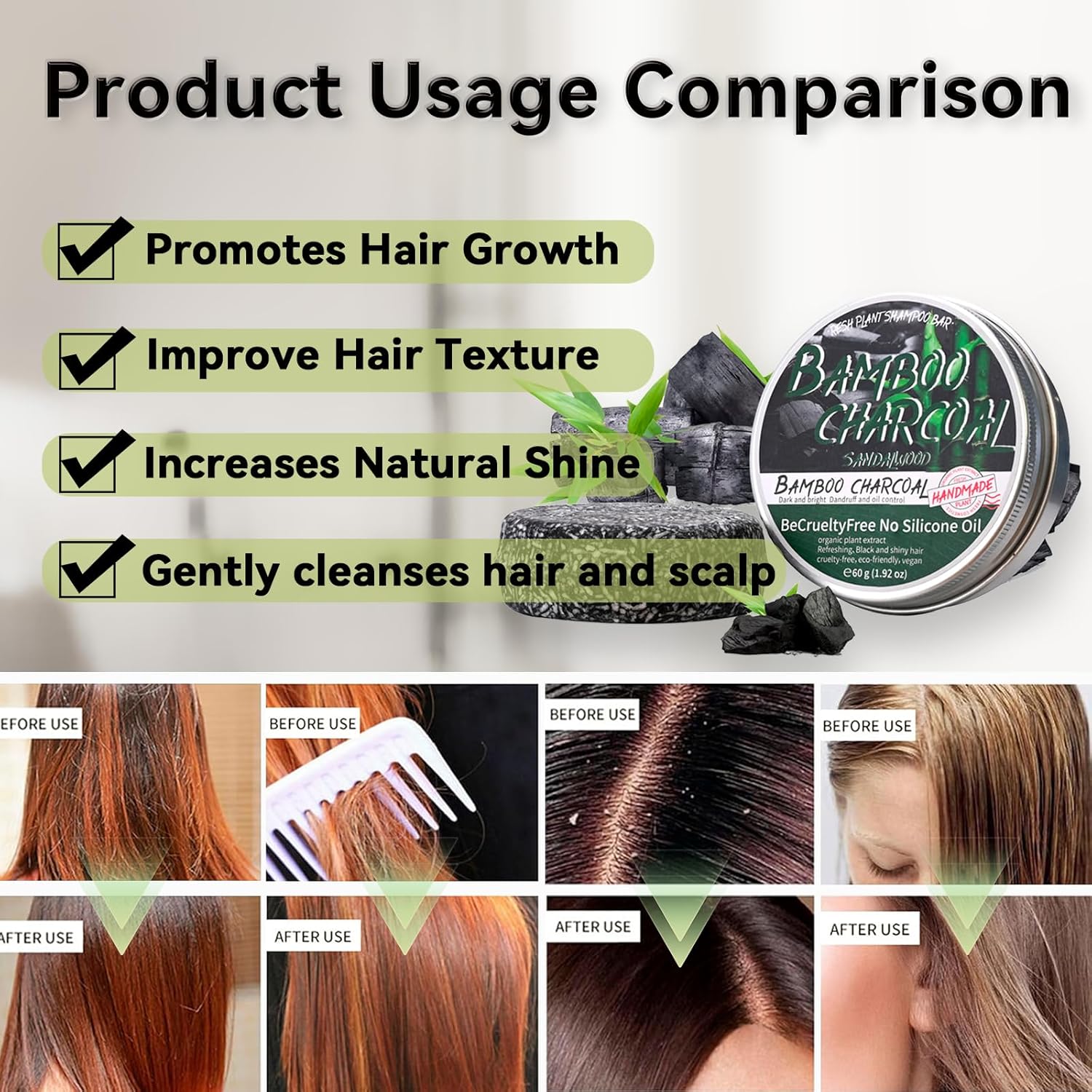 - 【Safe Ingredients】Bamboo Charcoal Shampoo Bar uses pure natural ingredients, including bamboo charcoal extract, shea butter, olive oil, coconut oil, and other ingredients. It has a mild effect and does not hurt the scalp. Therefore, you can use it with confidence even if you have sensitive skin.