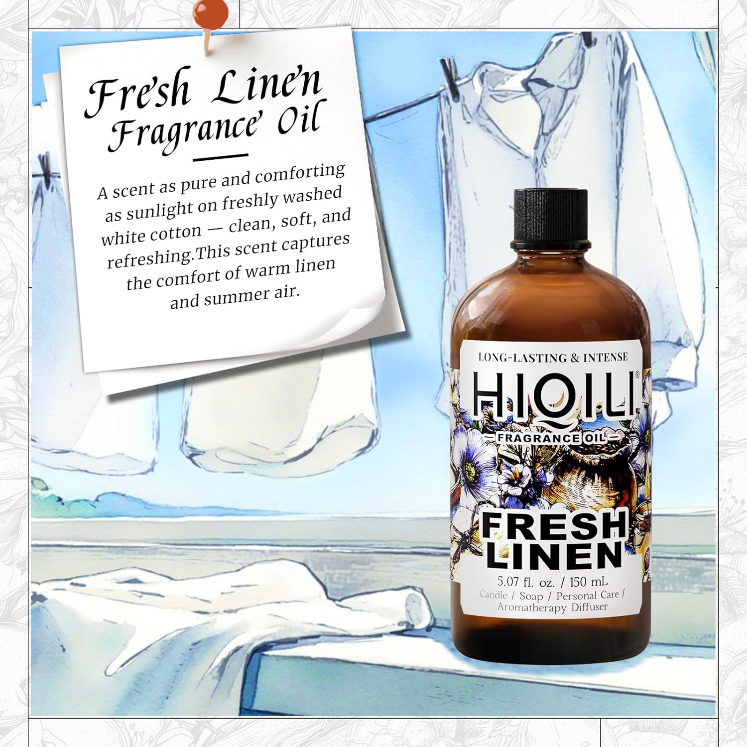 HIQILI Fresh Linen Fragrance Oil for Candle & Room Spray Making, Add to Dryer Balls, Freshie Scents for Essential Oil Diffuser - 5.07 Fl Oz