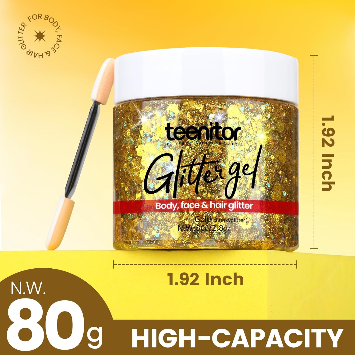 - Teenitor GOLD body glitter gel boasts a stunning mix of large, small glitter pieces, and fine powder, creating a mesmerizing shimmer that's perfect for the festive spirit of Christmas and any carnival. The vibrant gold hue adds a pop of color to your celebrations, making you stand out in the crowd