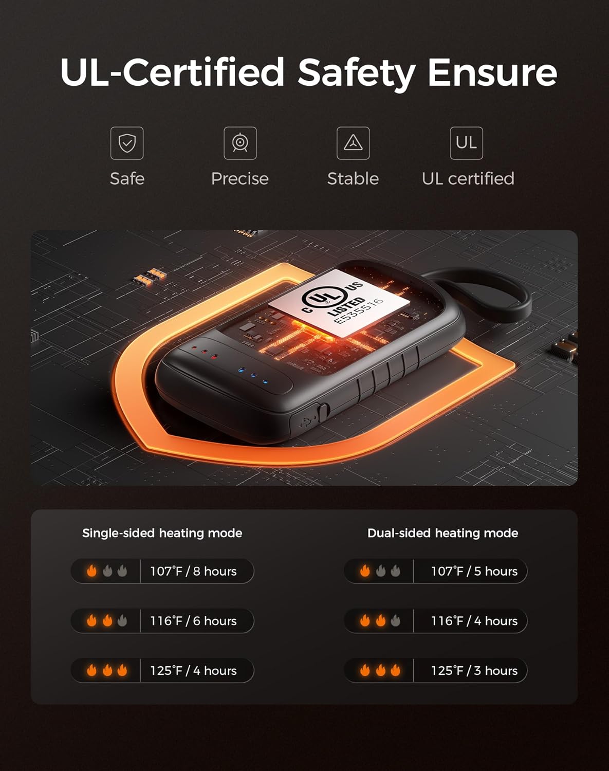 - Certified Safe & Built to Last – This usb hand warmers feature UL-certified batteries (E535516) with ultra-durable ABS shell, and full protection against overheating or overcharging. Stay warm up to 8 hours max on a single charge.