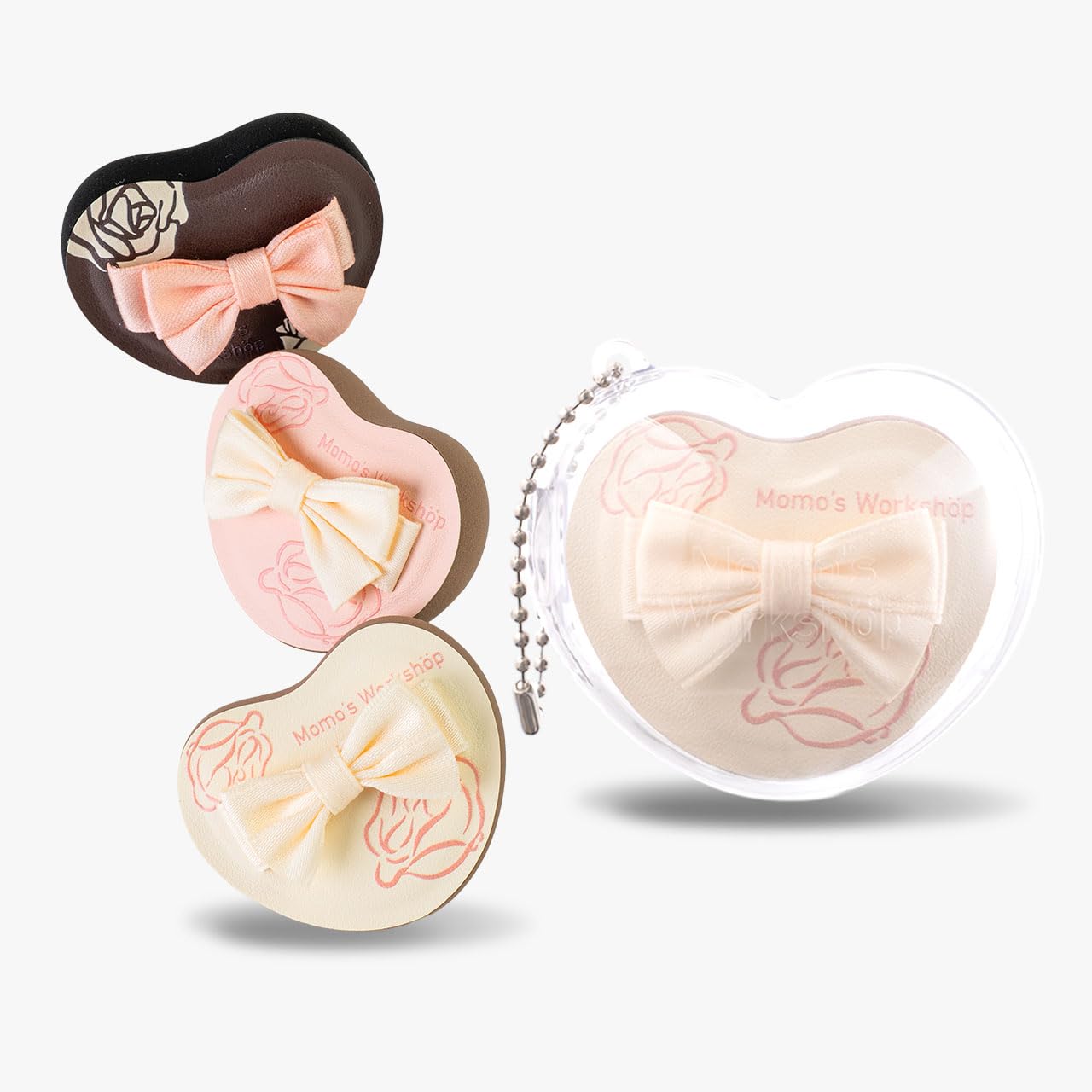 Heart-Shaped Makeup Sponge,Firm Bounce Rubycell, Foundation Sponge with Bow Tie Strap, for Precision Blending of Concealer/Cream Products, 3-Colors,Travel Friendly & Reusable & Storage Case